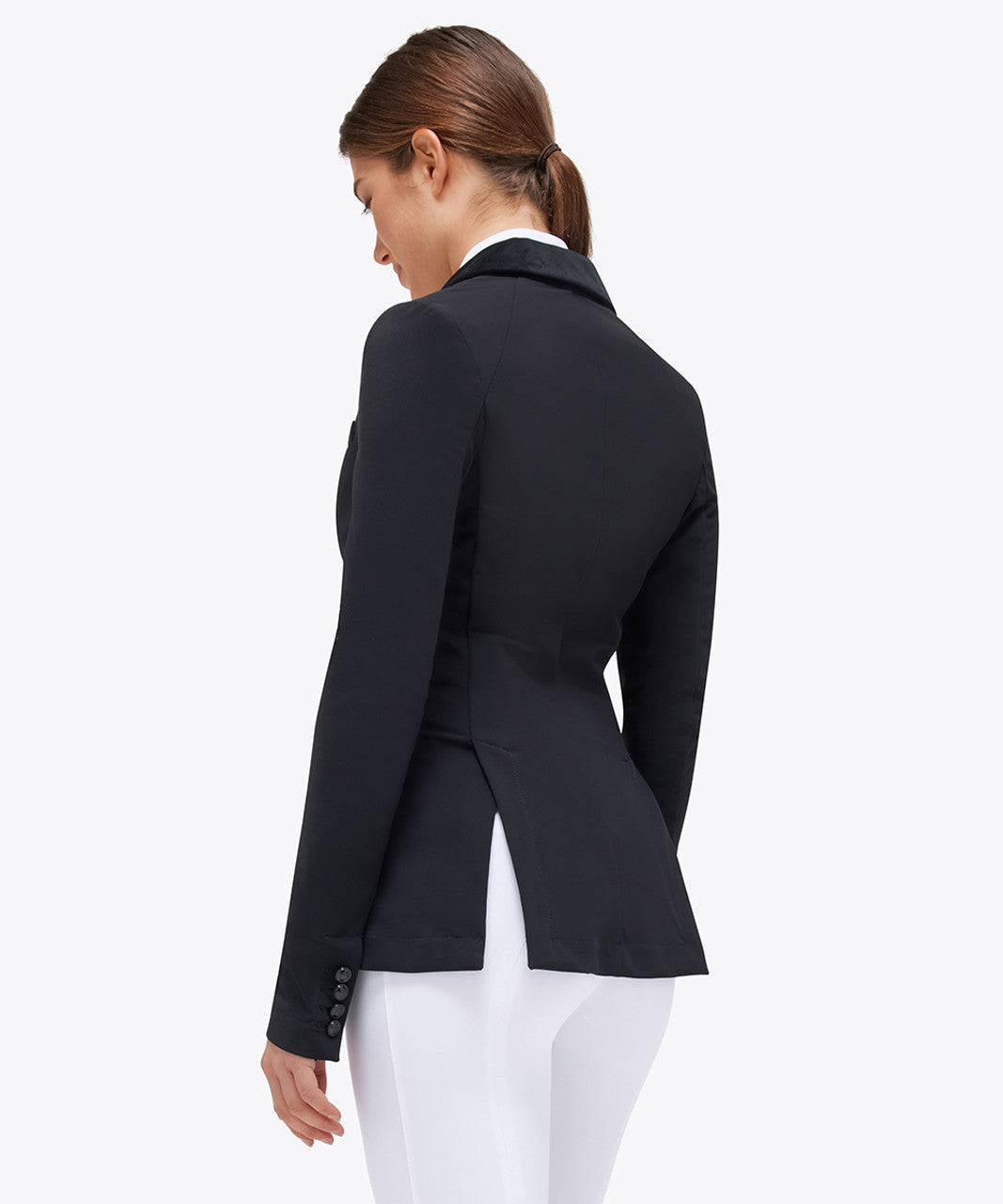 Cavalleria Toscana Smoking Jacket moves with you effortlessly while offering breathability, water repellence, and odor control. Flattering seams and fine details like an alcantara collar, front pockets with alcantrara trim, and refined buttons give this equestrian competition jacket extra flair. Cavalleria Toscana Smoking Riding Jacket will look sublime with your favorite Cavalleria Toscana show shirts.