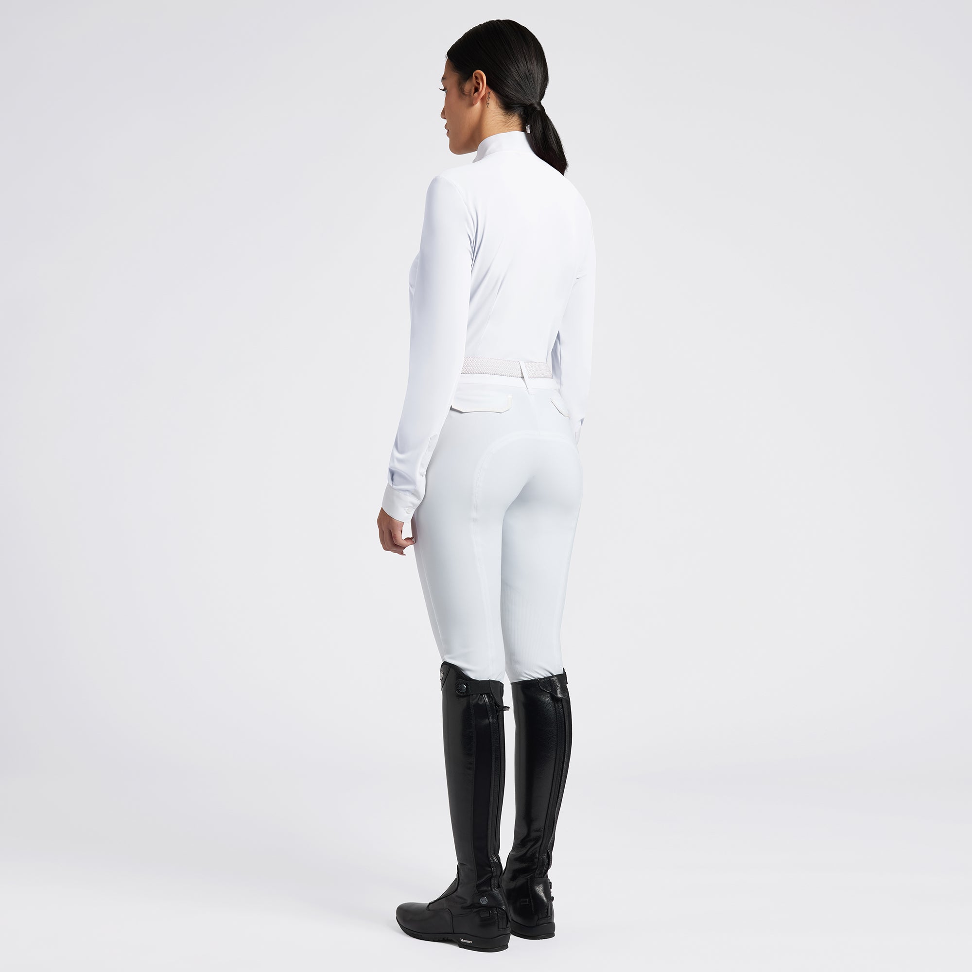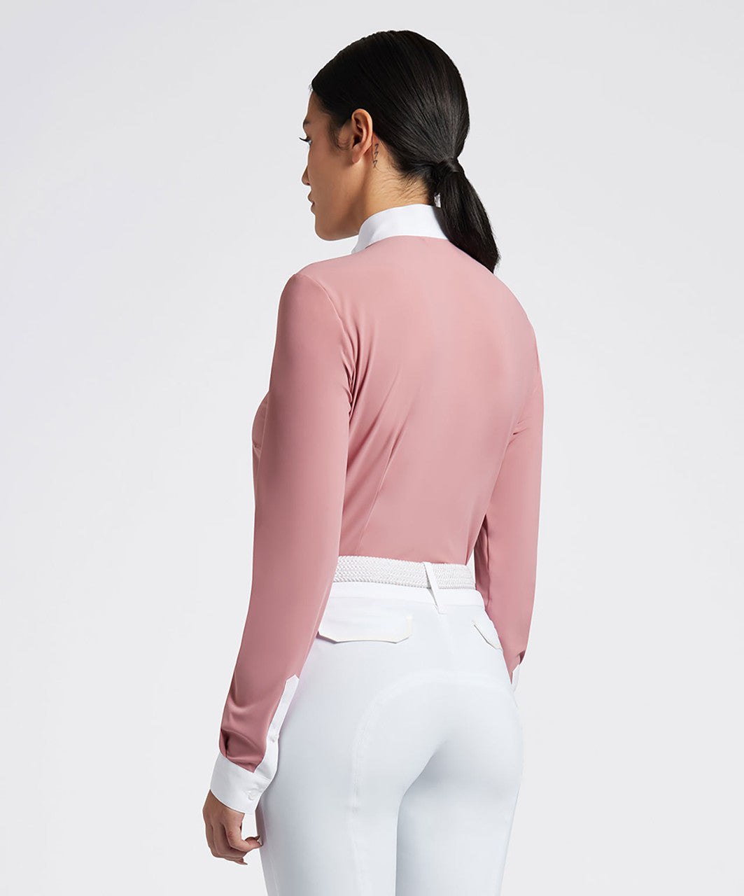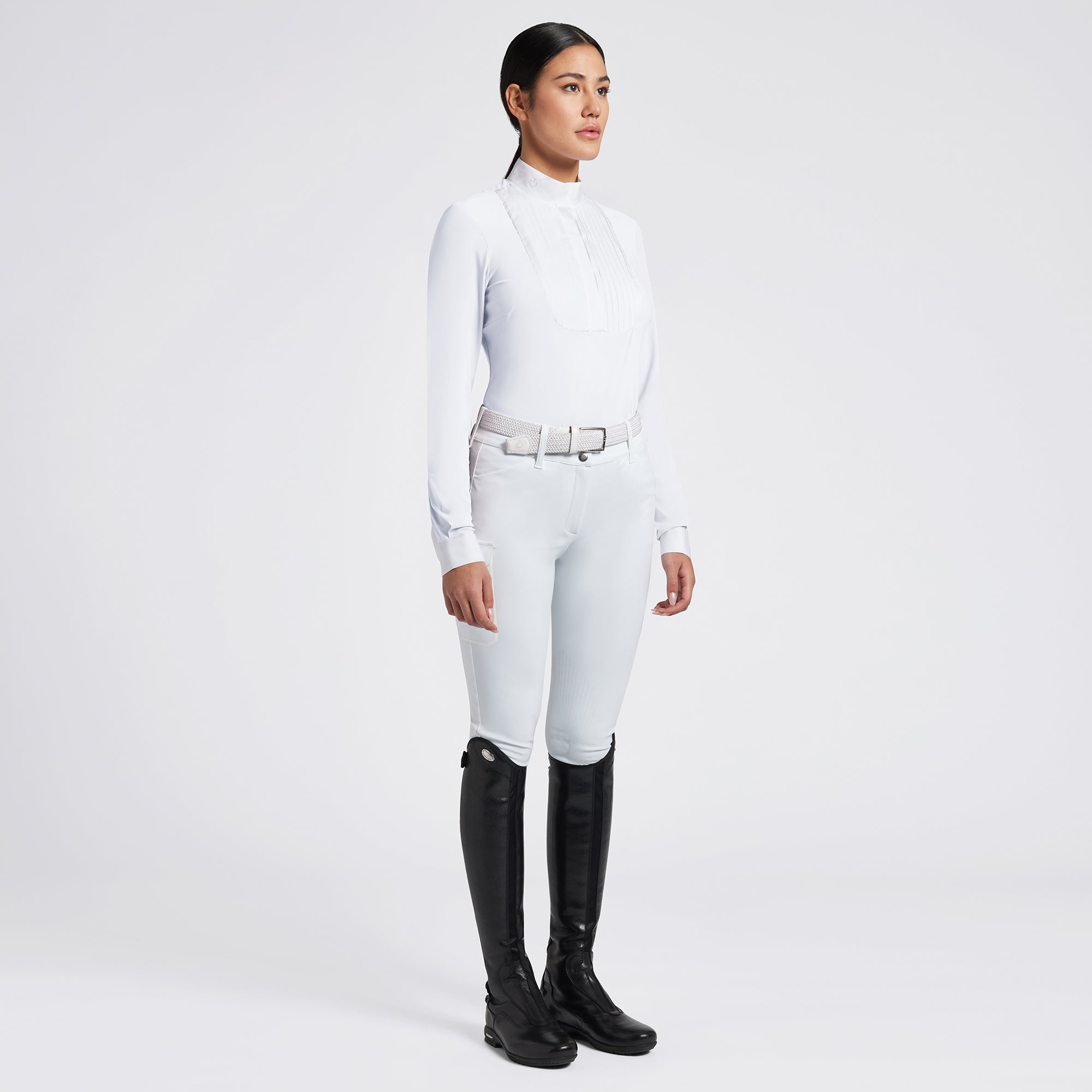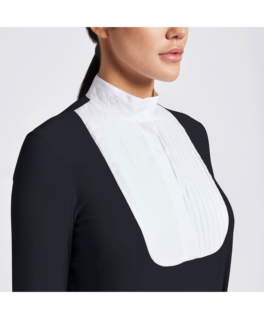 Cavalleria Toscana Pleated Bib Jersey Show Shirt with long sleeves is super clean and crisp with all the modern technology and design for comfort and show arena style. The black long sleeve equestrian show shirt for women is a lightweight stretch jersey. The ventilation is superb for summer horse showing. A white poplin bib, show collar, and cuffs keep the look classic.