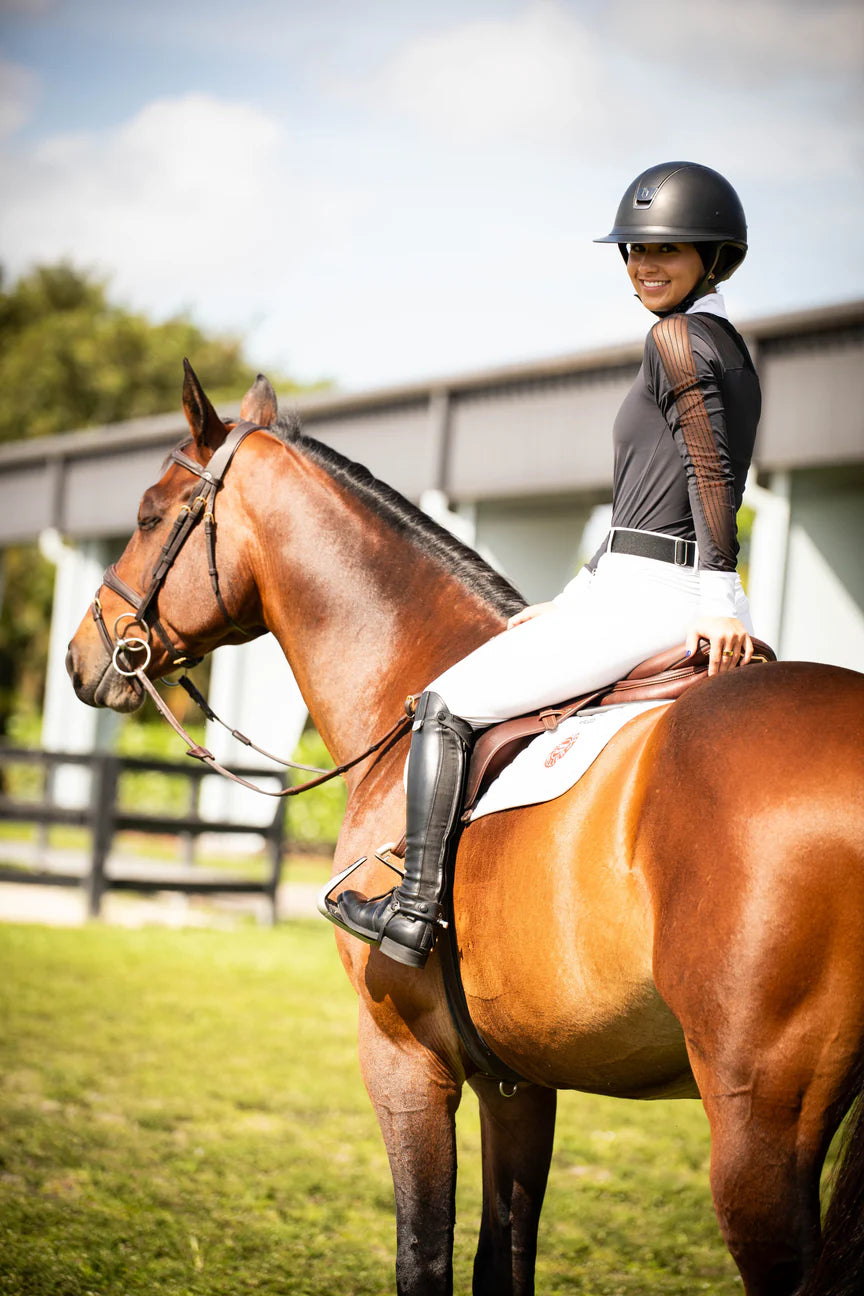 The Palm Beach features a dura-mesh striped lace detailing down the arm, shoulder and upper back. Our mesh always moves with you and is never constricting. If you are a hunter rider the lace detailing does not show with your coat on!