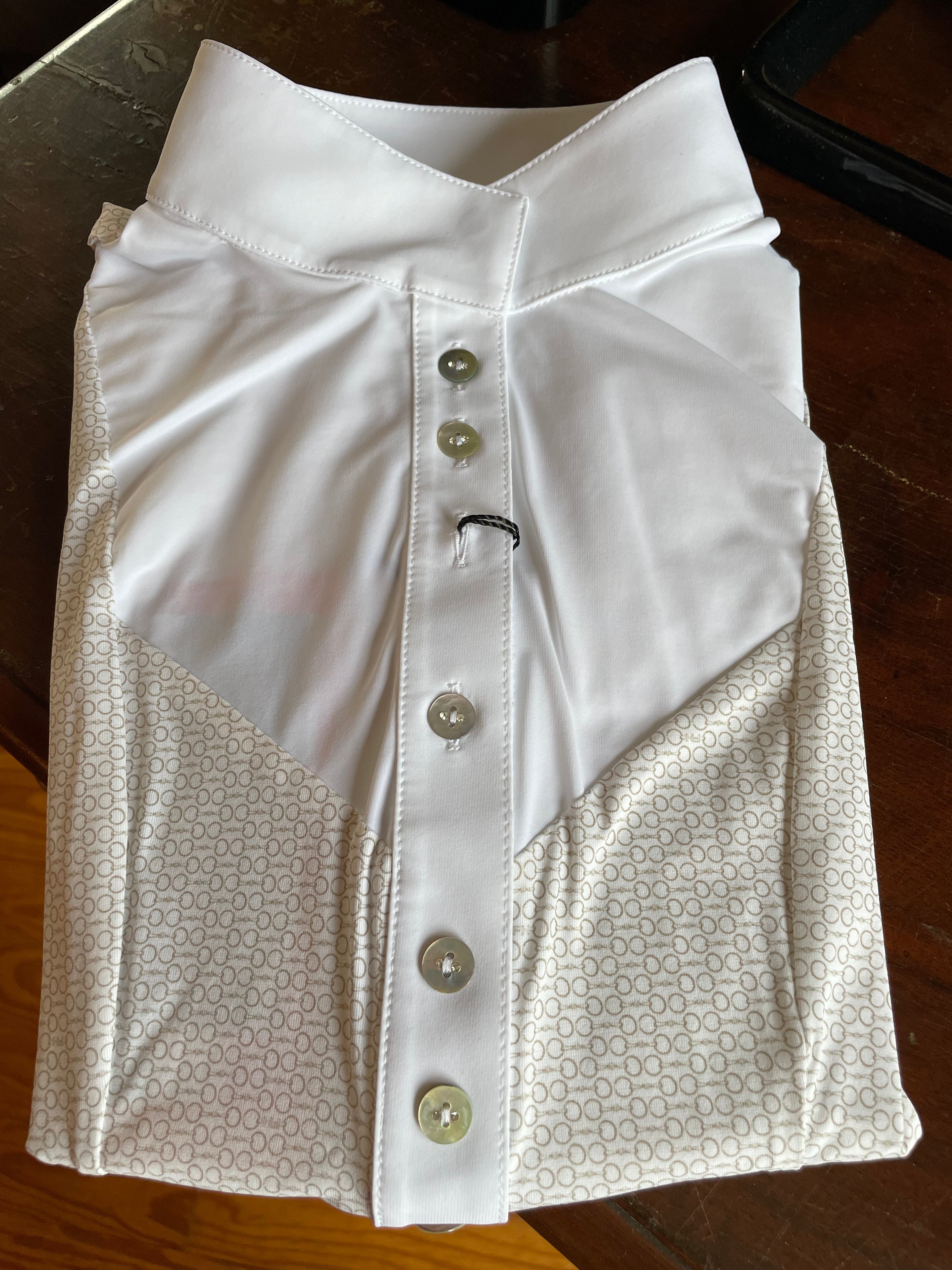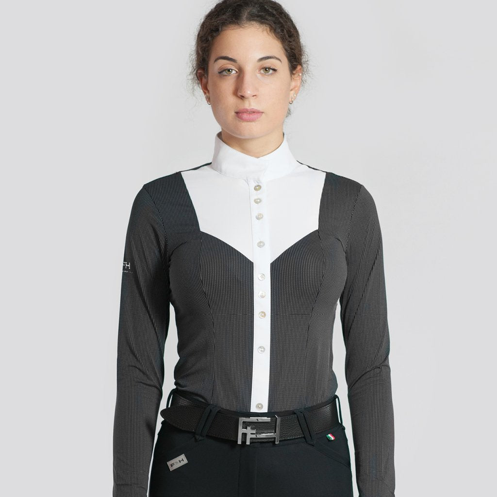 GRISELDA is an original FH pattern shirt with a classic collar and bib that incorporates technical features such as breathability and high elasticity with a feminine look. Soft, second skin feel fabric is smooth underneath a competition jacket. Long sleeves and UV protection.