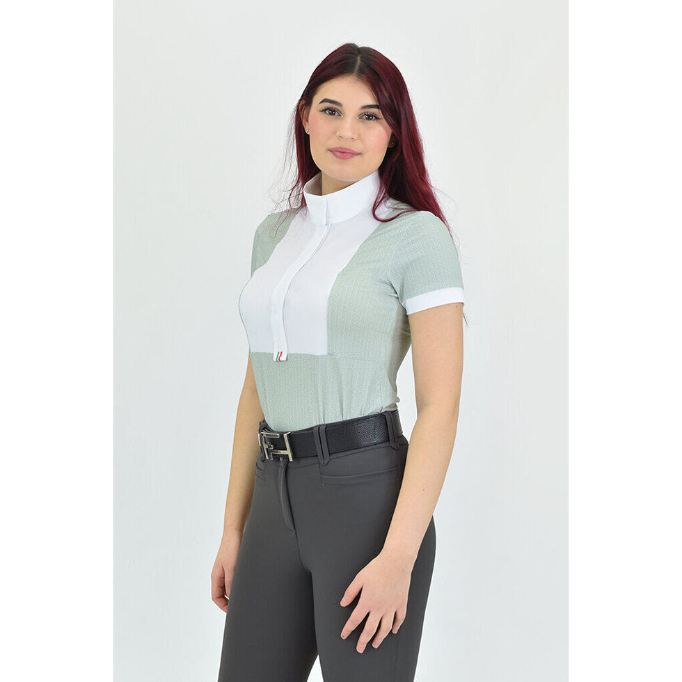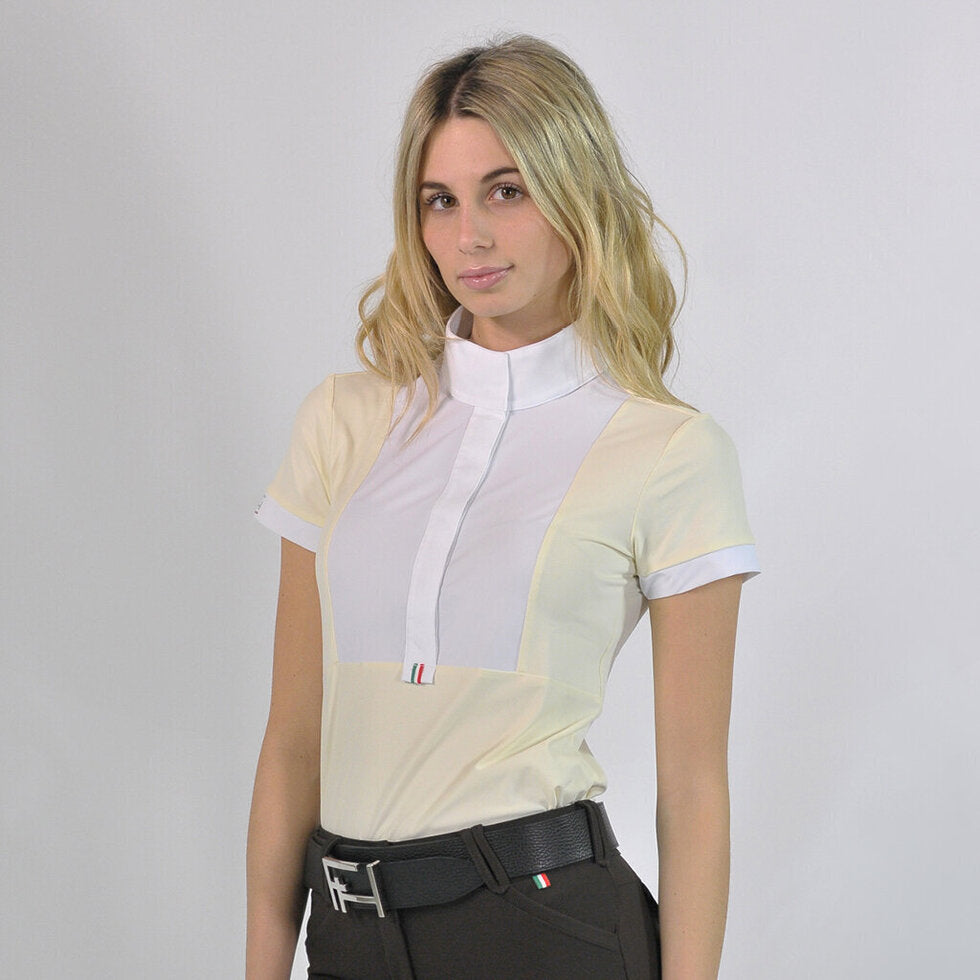 DAPHNE. This elegant, comfortable short-sleeved competition show shirt combines an innovative and modern fabric with a classic equestrian style. Suitable for all seasons thanks to its breathability, silky moisture-wicking feel, and UV protection.
