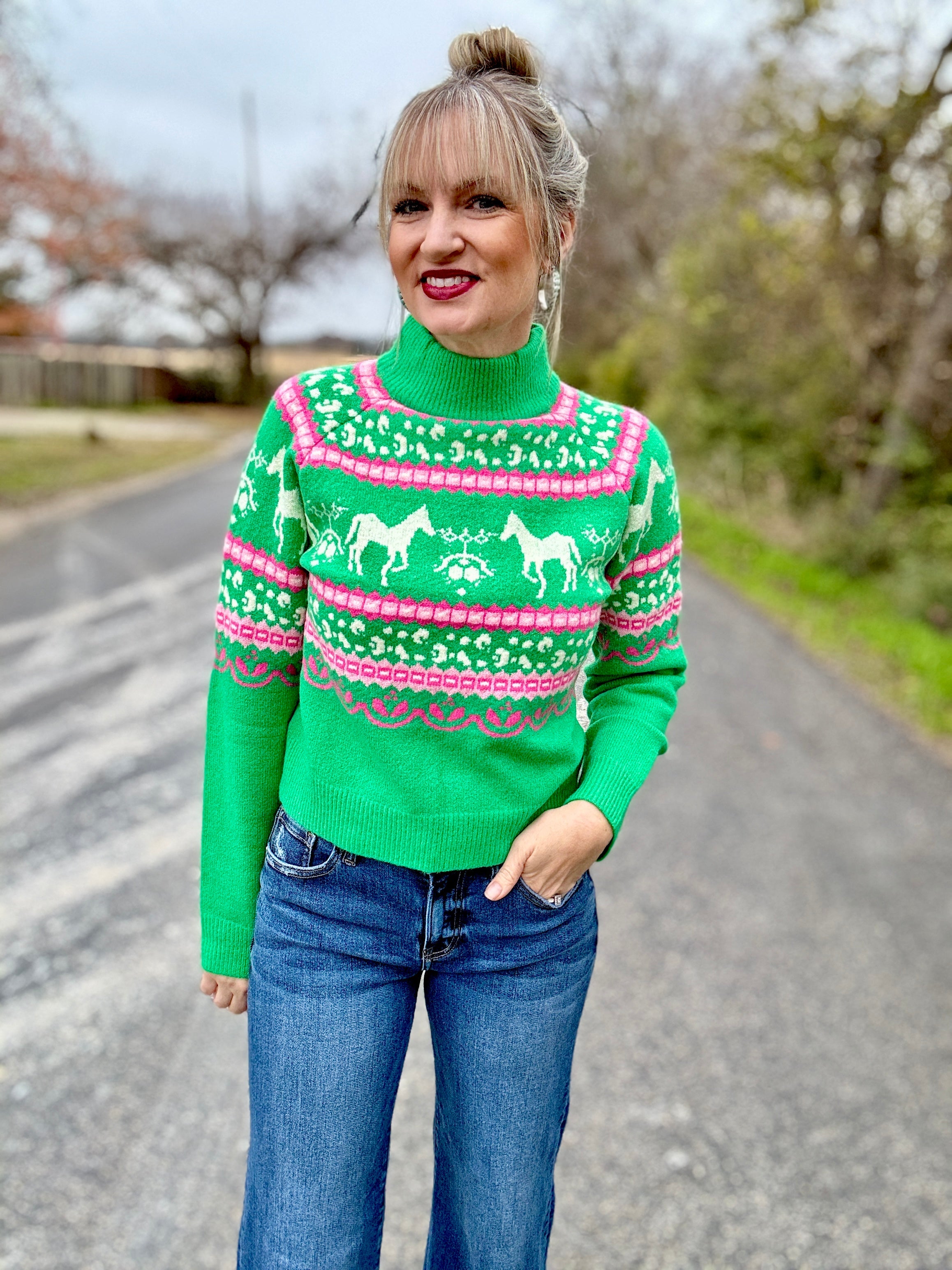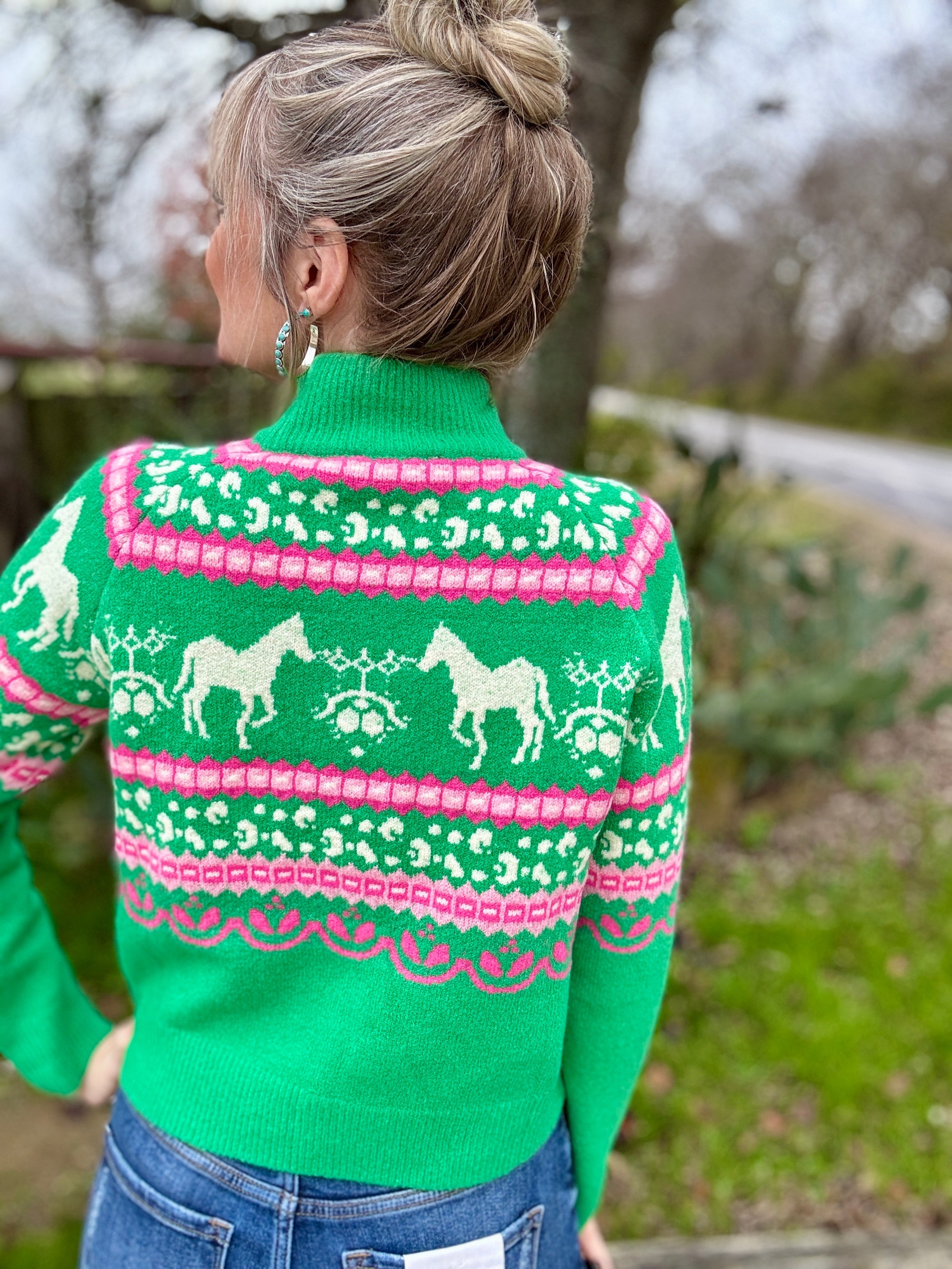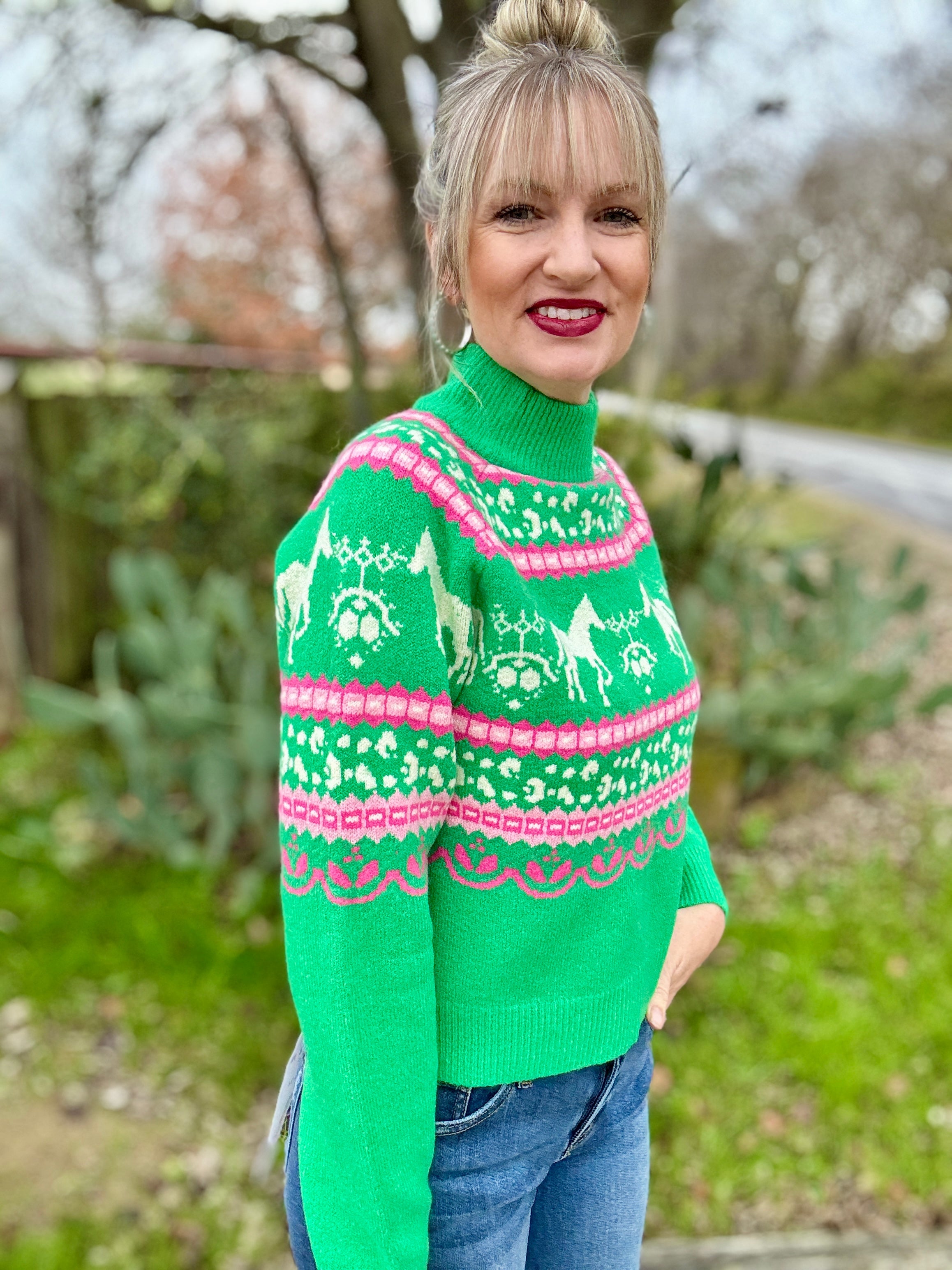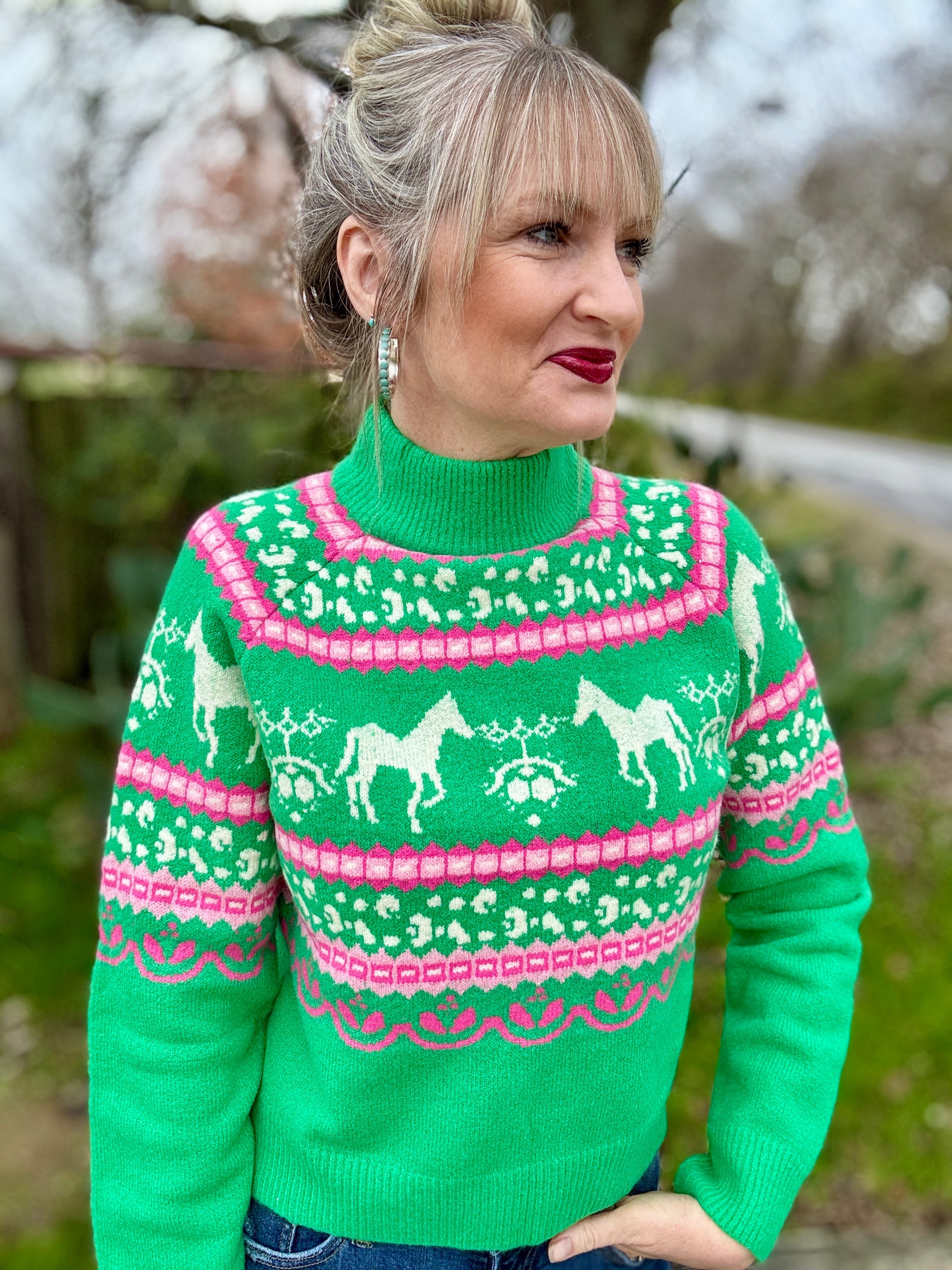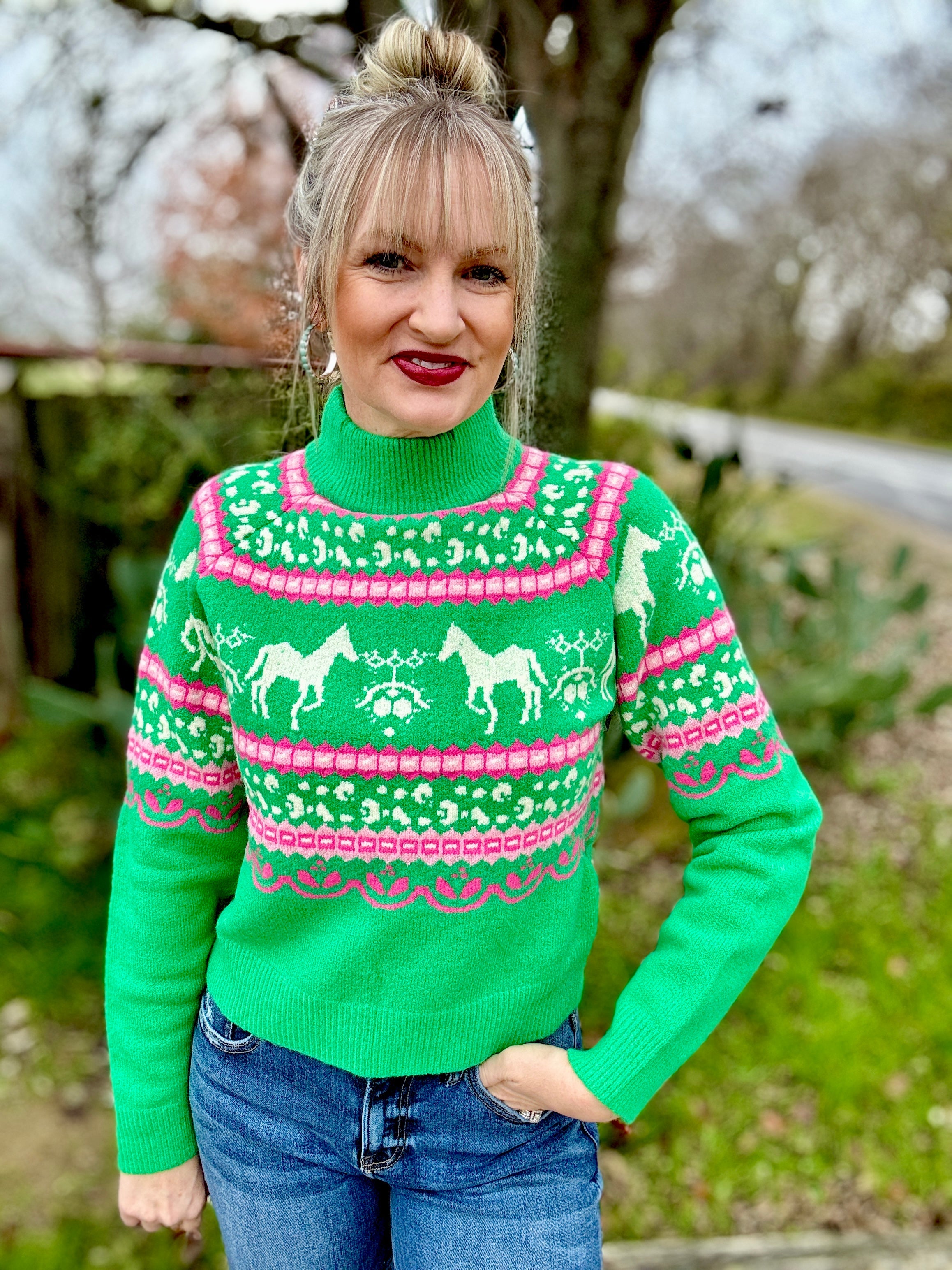 Get ready to stand out this winter with our Fair Isle sweater! With a playful mock neck and a bright pink and green design, this sweater is perfect for adding some fun to your winter wardrobe. And let's be honest, who doesn't want a horse on their sweater? ;)