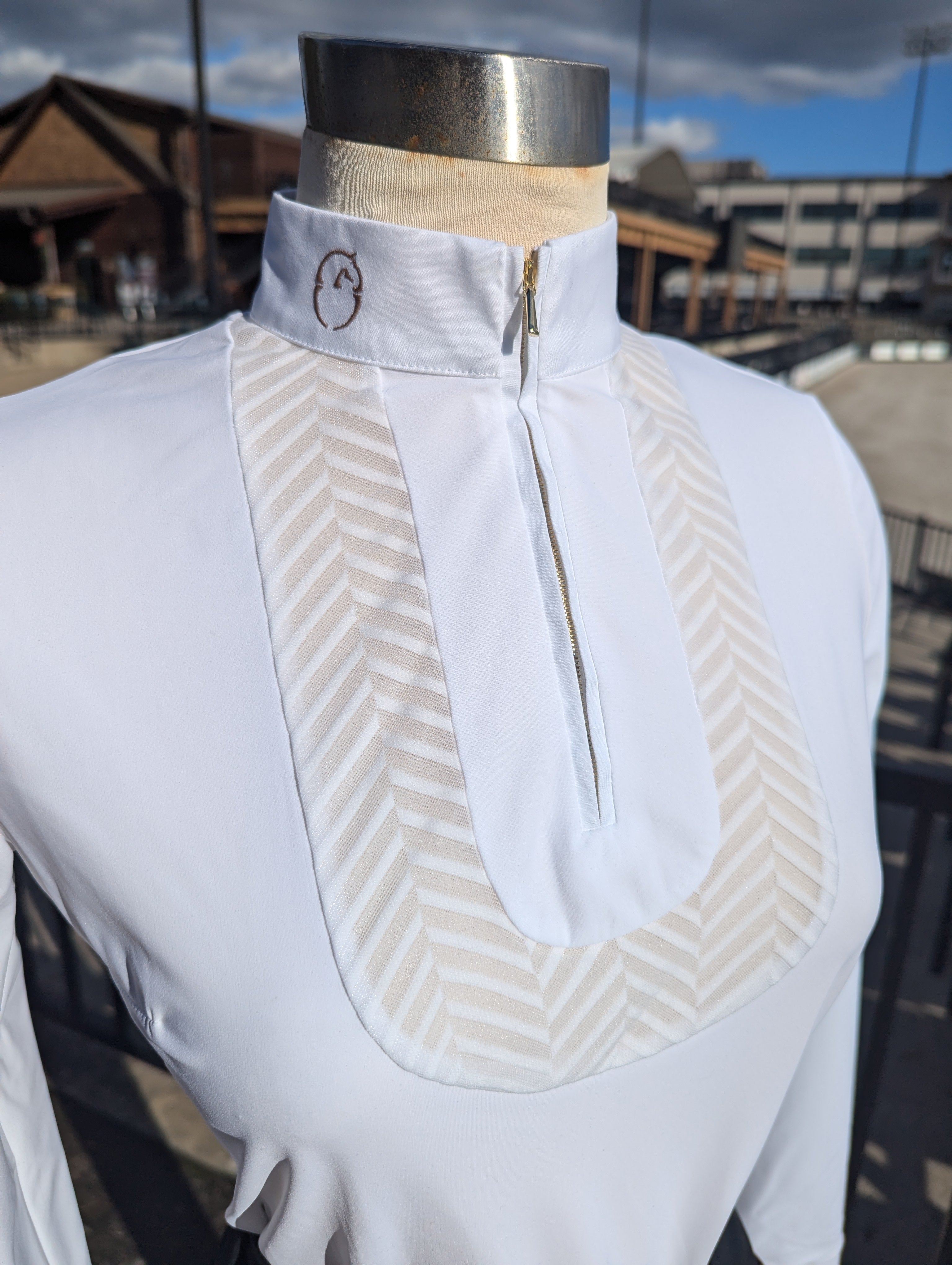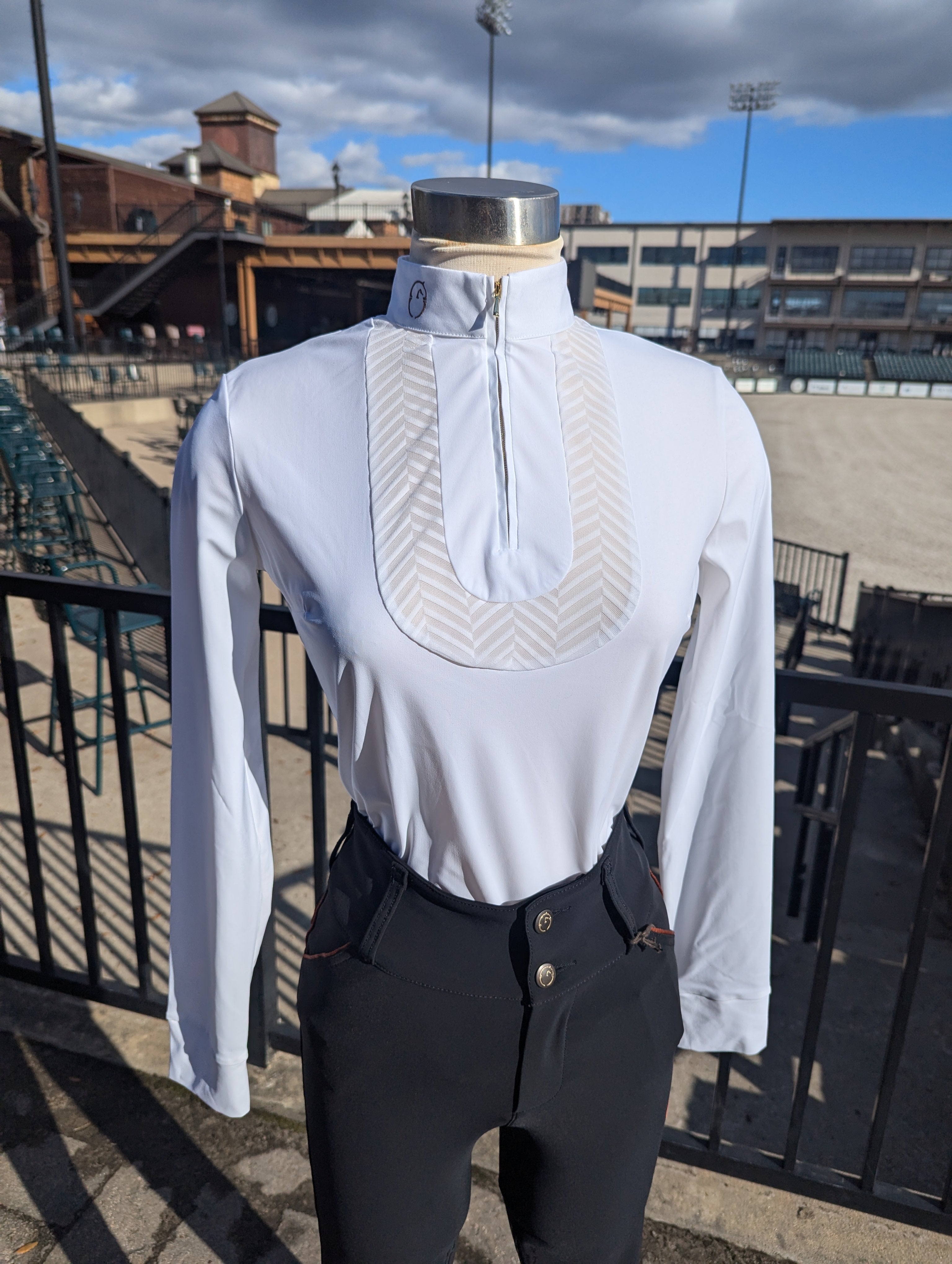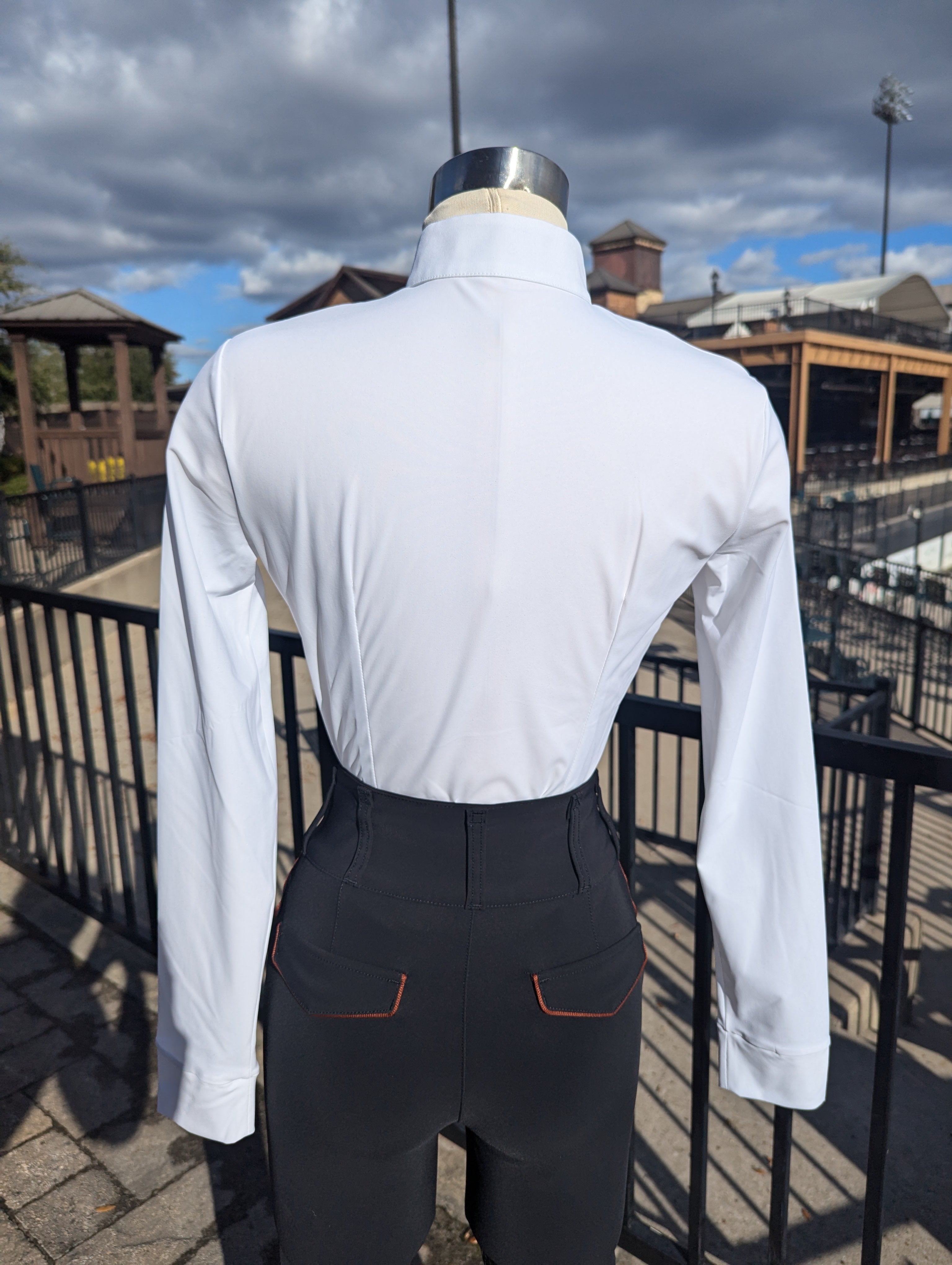Introducing the Vestrum Klaipedia Long Sleeved Ladies Competition Shirt - the ultimate ladies riding shirt, show shirt, and training shirt. Crafted from high-performance breathable fabric and featuring a chic, stylish design with iconic 'bib' detailing. This shirt pairs perfectly with our Vestrum show coats for a truly winning look.