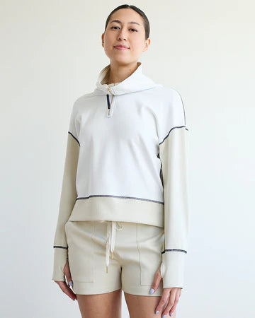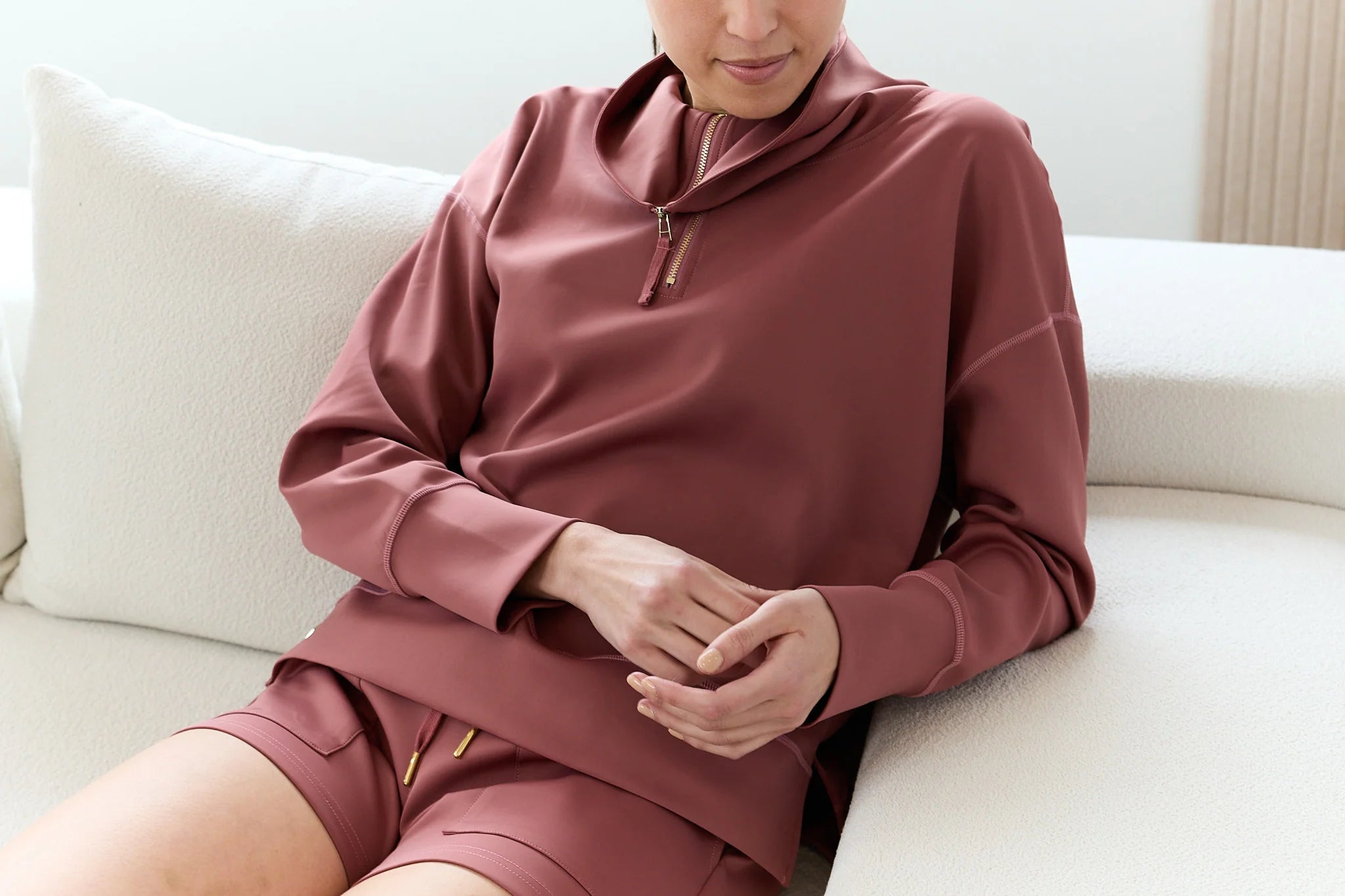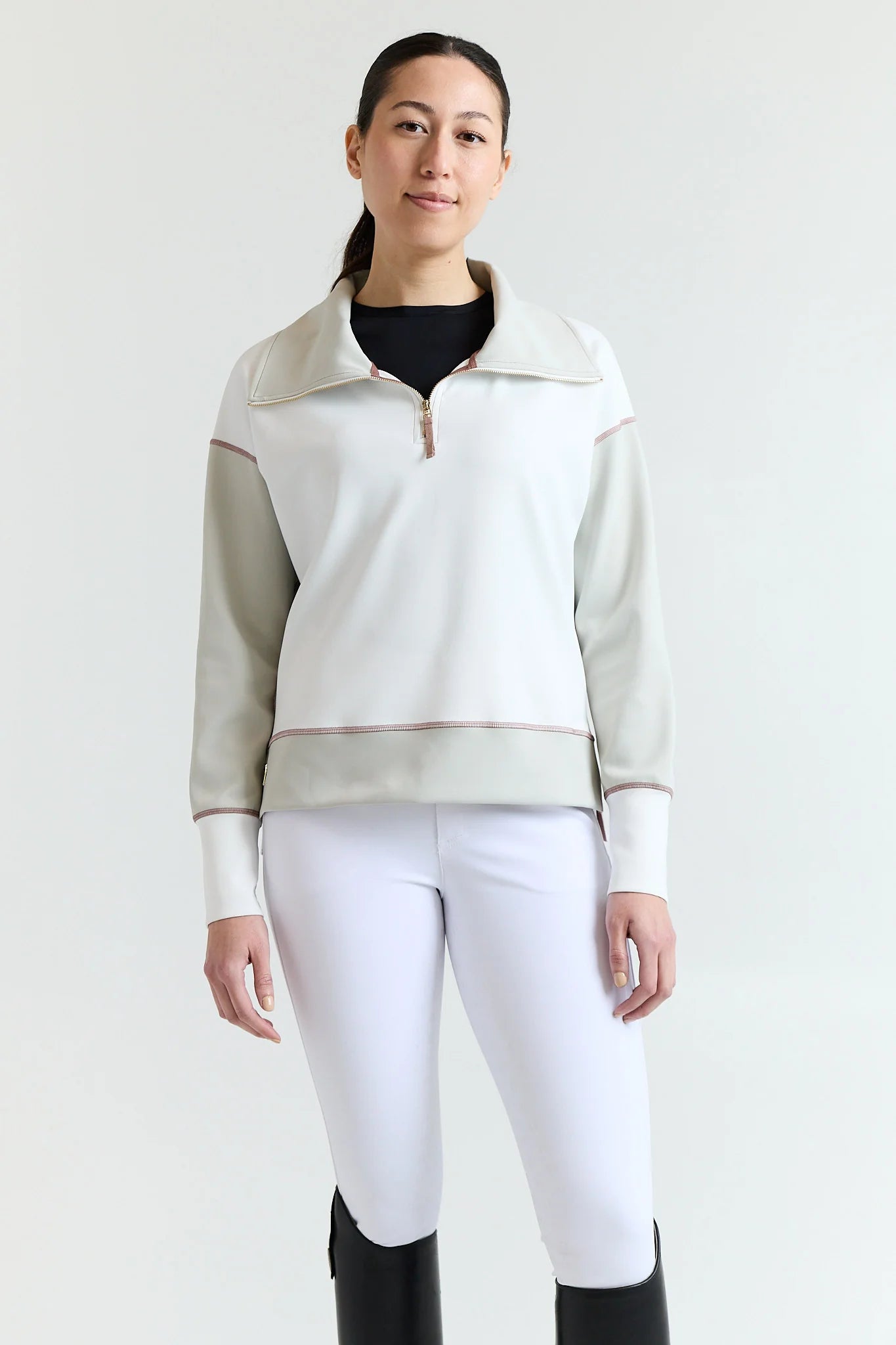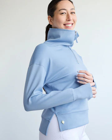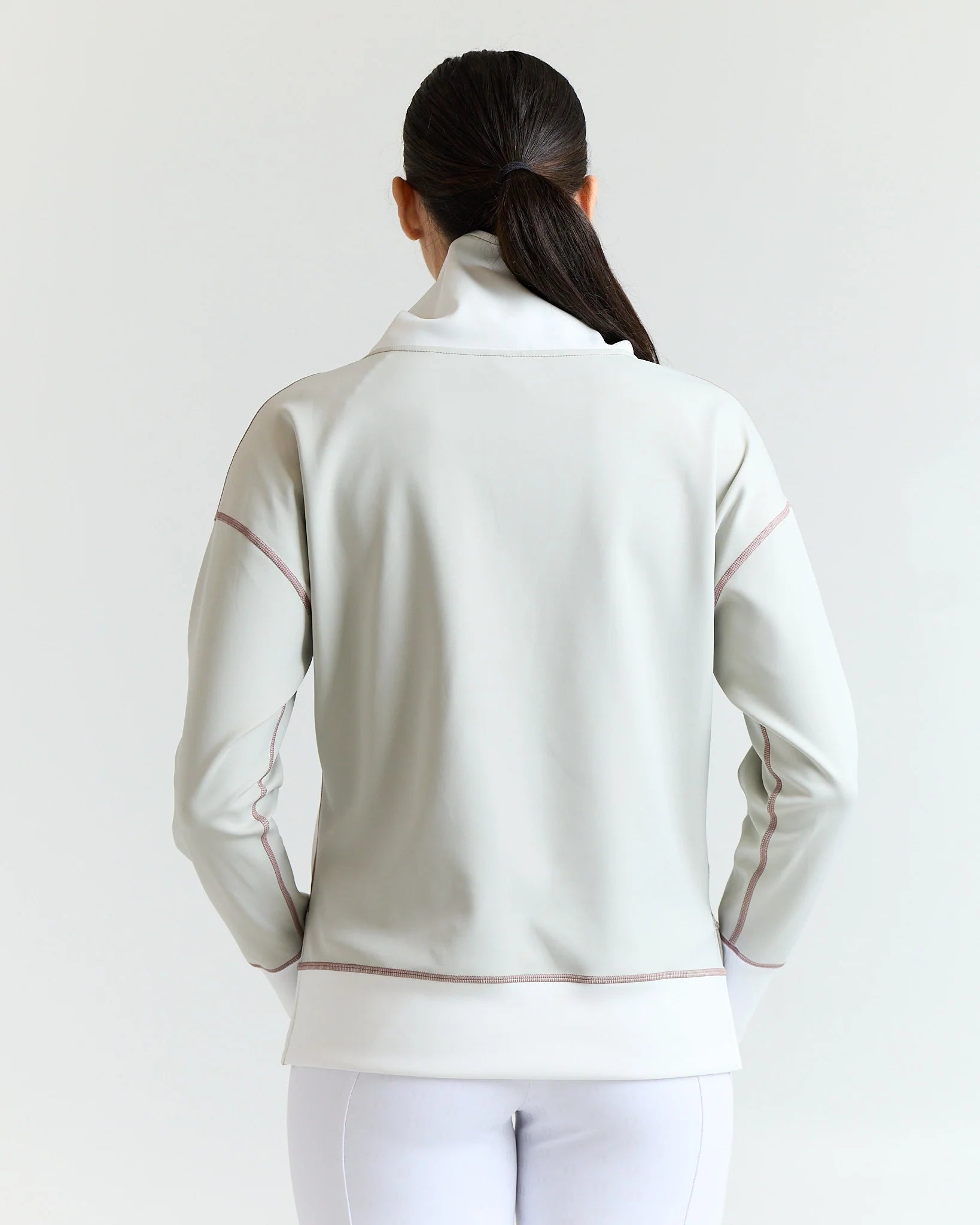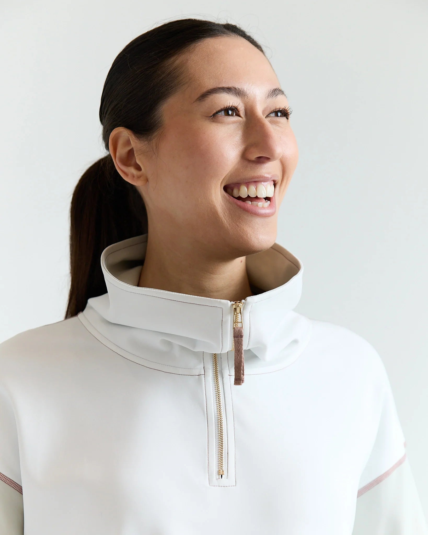 From the from our Apres Sport Collection, micro crystal sleeve stars shimmer on the Half Zip Sweatshirt in wicking scuba. The ideal top to layer while active and after.