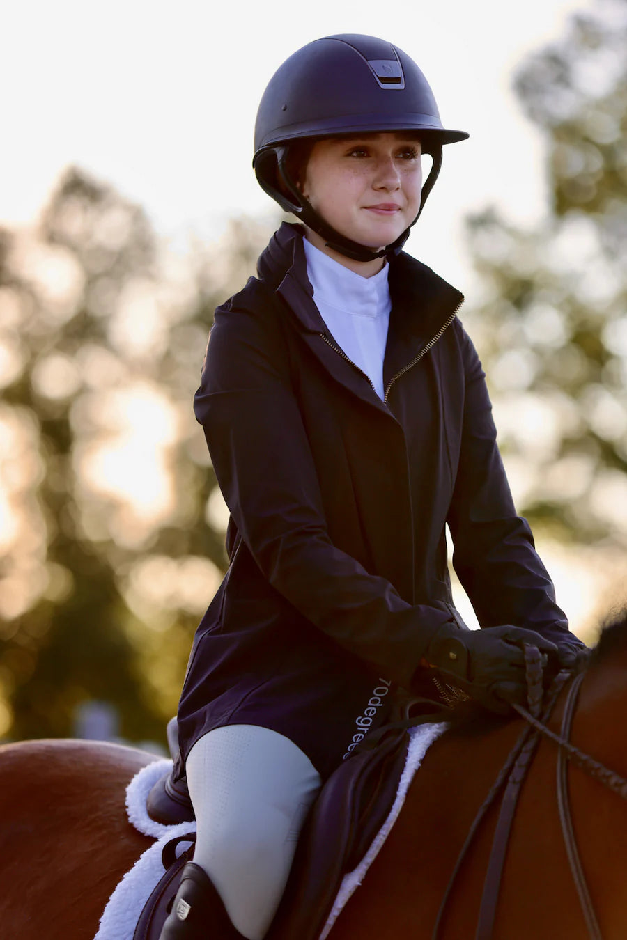 The perfect raincoat for riding in our stretch Hydro Crepe fabric that is completely waterproof.