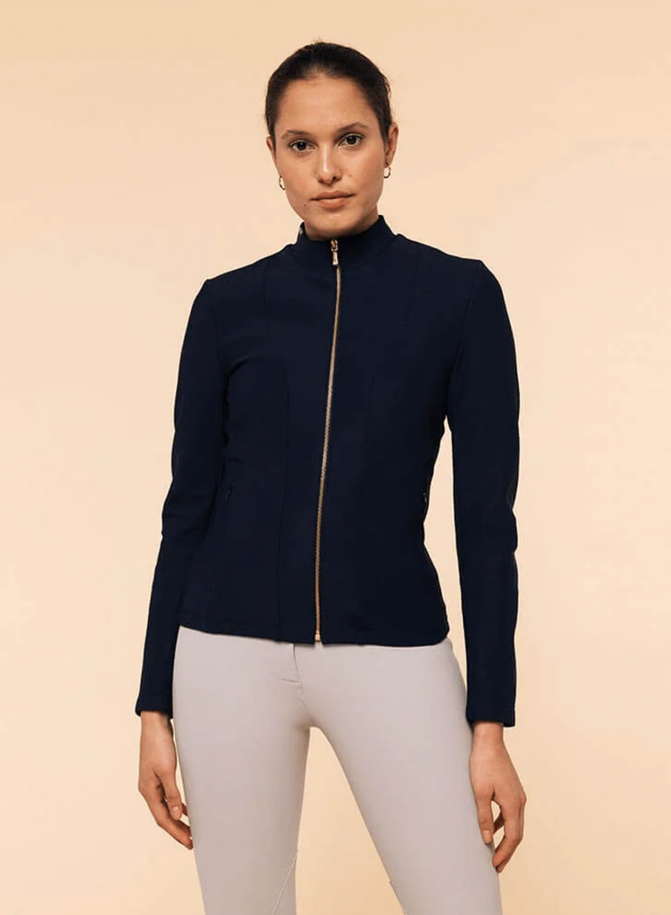 Description : Description: This softshell jacket is an essential for your training sessions. With its slim fit, it offers technicality, comfort and elegance and protects you from the cold while remaining breathable. The color palette Ghana is available in black and navy. Design We imagined this training jacket with feminine cuts in the Dada Sport codes, we also decided to use softshell technology for maximum technicality. Its fabric scraped inside protects you from the cold while remaining breathable. It was also thought out in detail with the pull tab, inspired by a farrier's nail, on the light gold zipper, mesh inserts under the arms and an officer's collar that transforms the silhouette and makes it a unique piece. Not to mention the signature DADA side label on the collar. Fabric To meet your expectations in terms of comfort and technicality, we chose an Italian fabric "Sensitive", very soft and breathable that provides optimal comfort. Its anti-UV technology protects you from the sun The fabric is made of bi-stretch microfiber (stretches in both directions), breathable and wrinkle-free. It is designed to be easy to care for, quick-drying and wrinkle-free. Size and care advice We recommend that you take your usual size to wear it snugly. If you have any doubts, you can also ask us for advice by contacting us directly on the chat. How to care for your Ghana jacket? We recommend that you machine wash the jacket inside out at a maximum of 30°C with a spin cycle of no more than 900 rpm. The best thing to do afterwards is to let the Ghana jacket dry on a hanger in the open air. Do not use a tumble dryer. You can then iron it on the reverse side at low temperature.