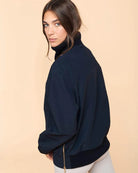 This jacket features ribbing on the collar and lower back. Gold-plated zippers on both sides of the bottom of the garment have been designed for ease of dressing.