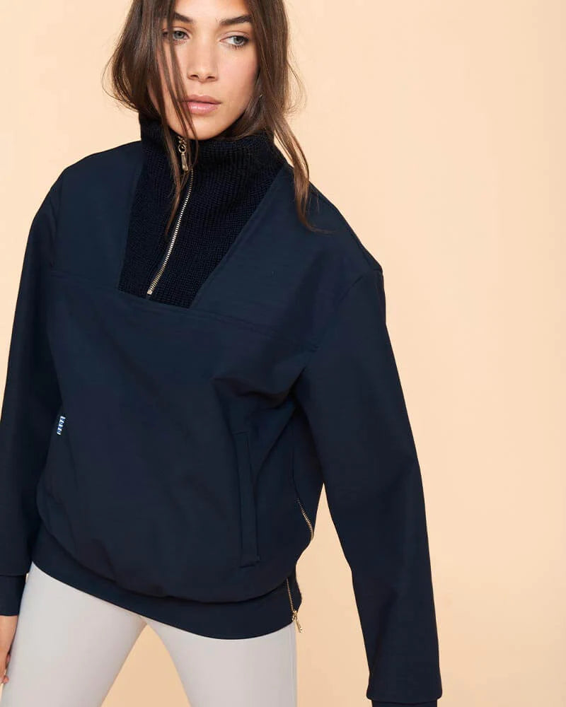 Derived from the men's wardrobe, this trucker jacket is an obvious choice for women's winter dressing. Its loose fit, signature knitted collar with a gold zipper designed from a farrier's nail marked with the dada logo, and vertical kangaroo pockets with piping, lined with brushed fleece and invisible zippers make it instantly identifiable.