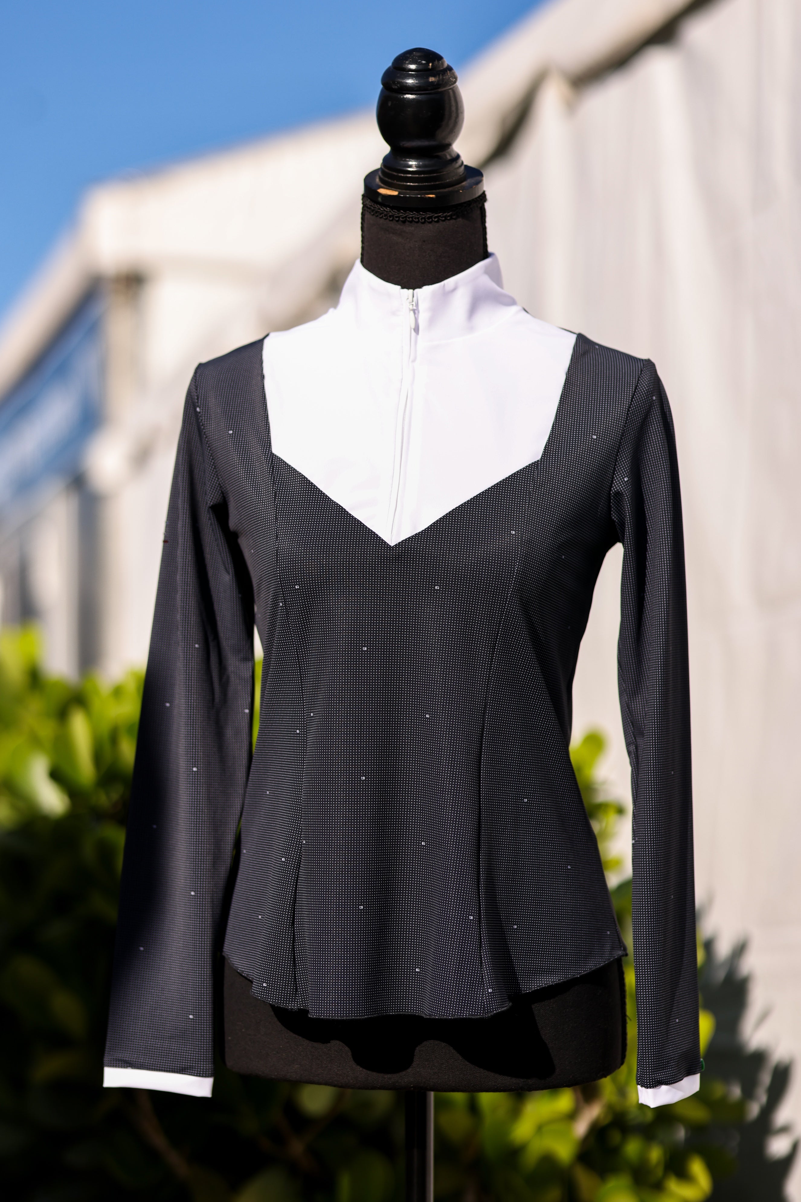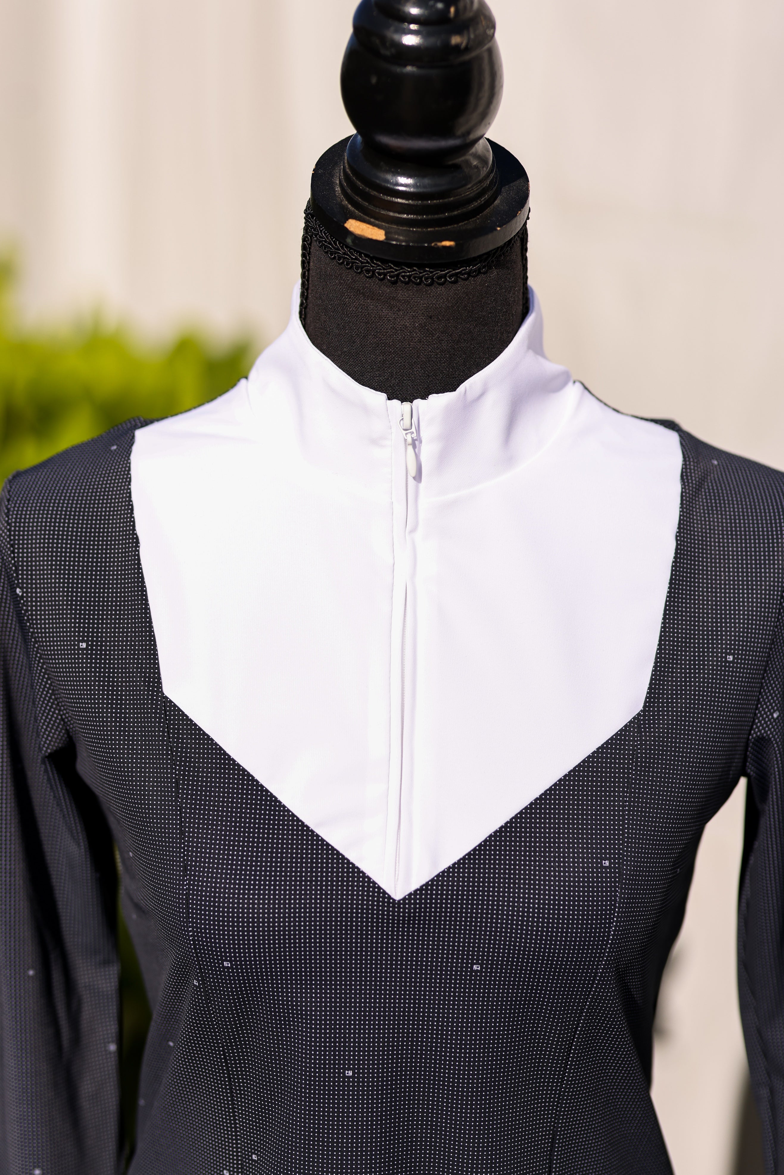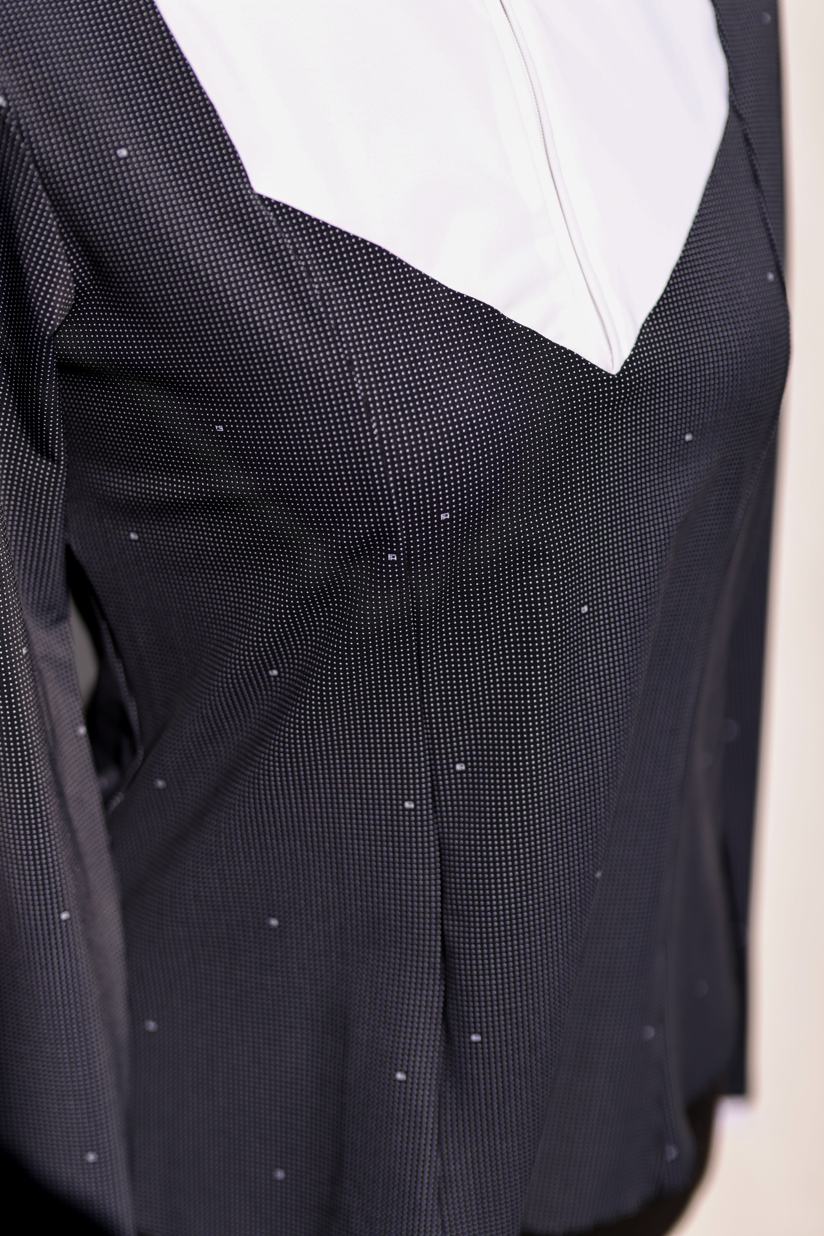 ELDA is a Silky Move long sleeve shirt, with a high white collar and flattering front panel that closes with a hidden front half zip. A must-have item for equestrians, with extra comfort, breathability and high UV protection, perfect for Jumpers and Dressage riders.