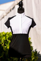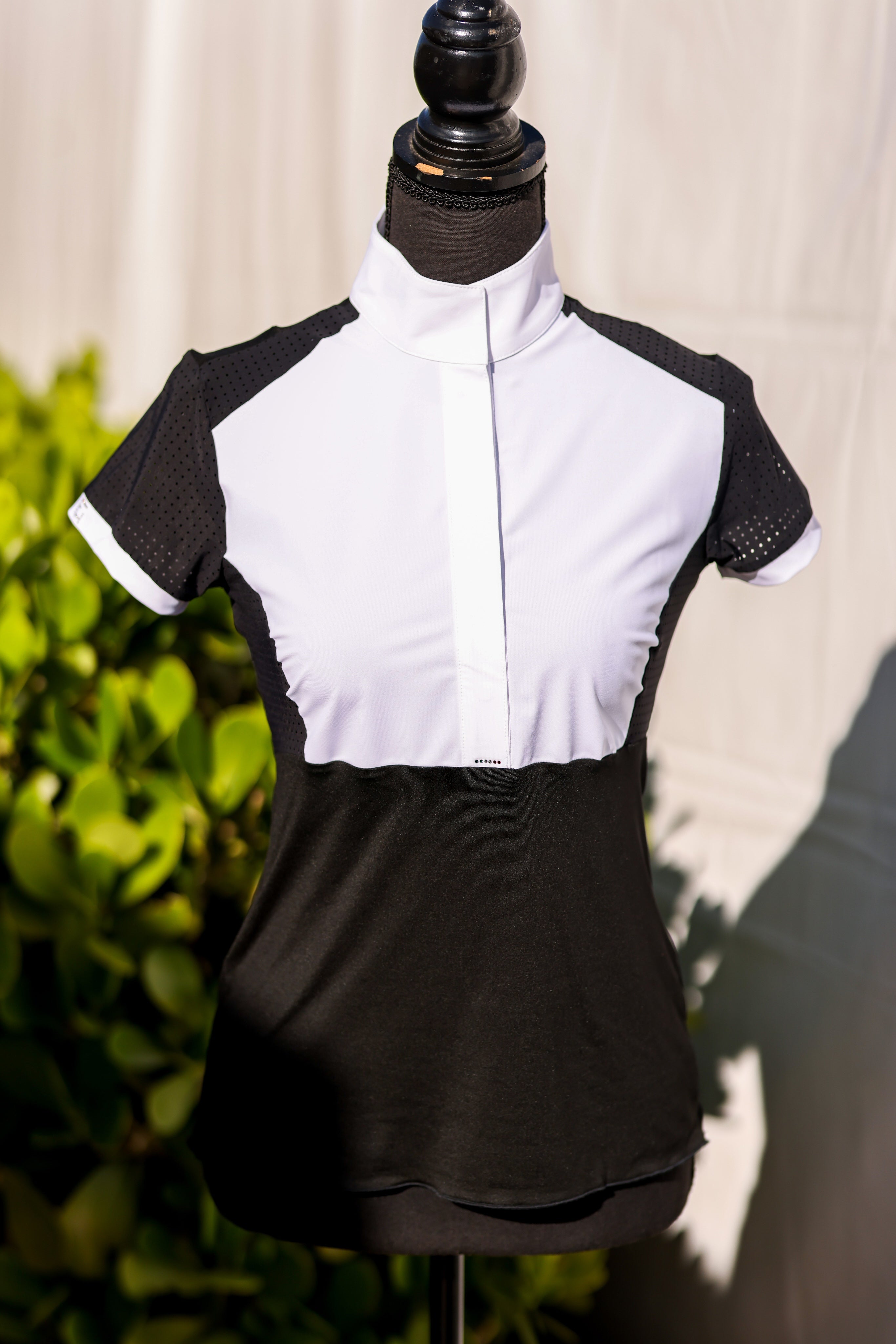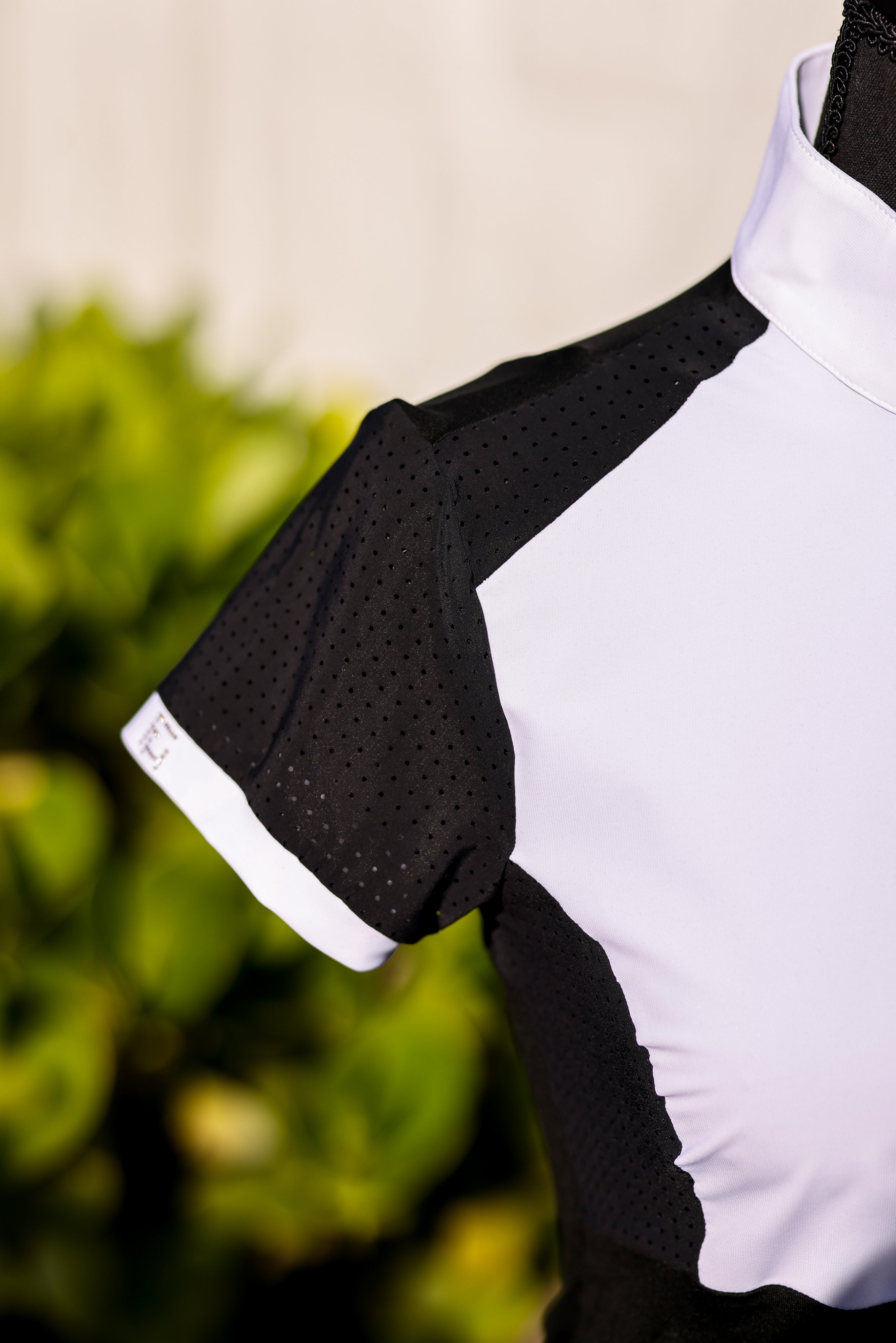 MELA is a Silky Move show shirt with a white lycra bib and soft micro perforated fabric details on the shoulder, sleeves and side panels. Extra comfort, bielastic, breathability and UV protection are the core features of this shirt, perfect to be worn under a show jacket or alone.