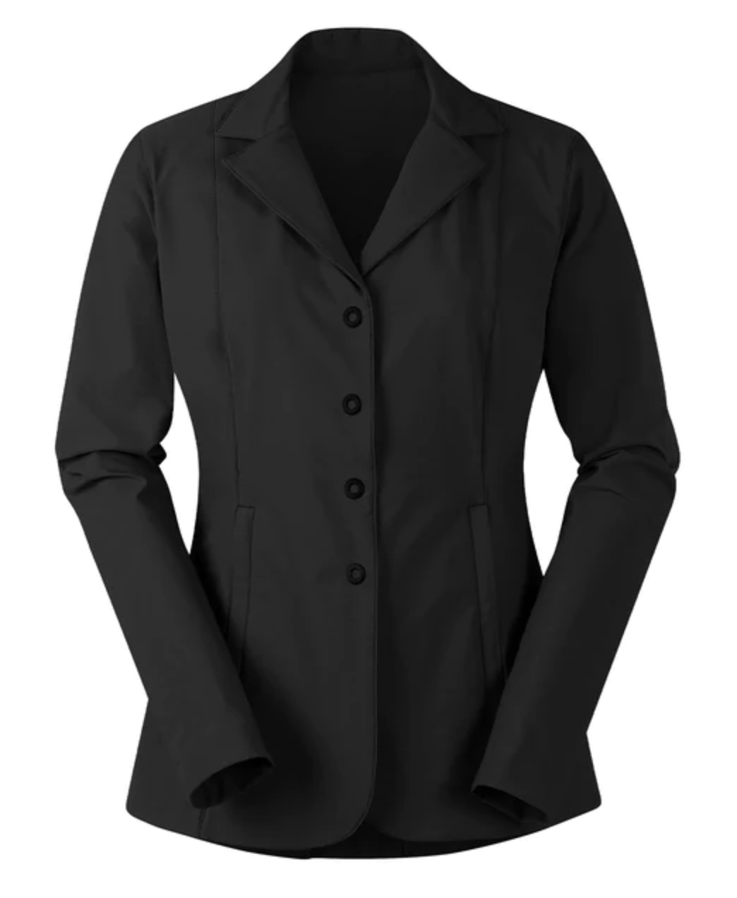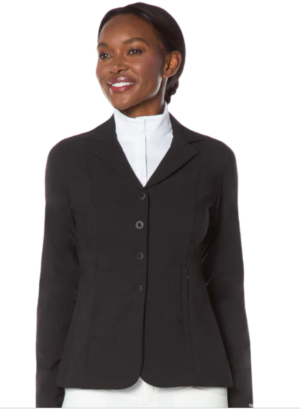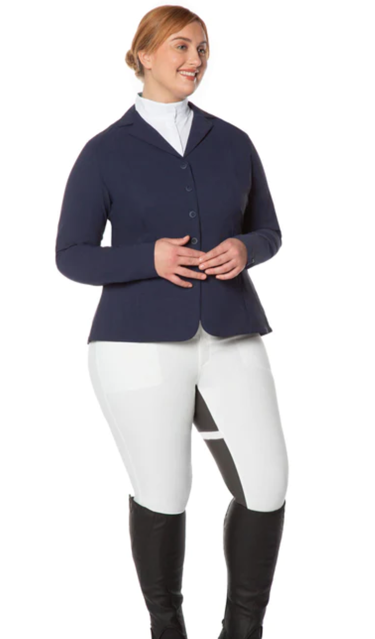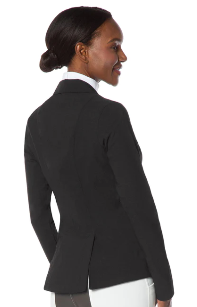 This all-season show coat may be the easiest thing about competing. Simply pull on an elegant, stain and weather-resistant silhouette that breathes and stretches in the saddle, then toss it in the wash for next time. No ironing. No worries. Strategic, contoured design flatters a range of body types. Hidden front zip with snaps stays smooth for a streamlined silhouette. Eyelets at waist secure riders’ number strings. Choose from 3 or 4-snap options.