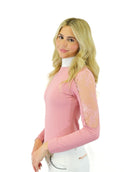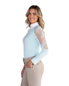 The Lilliana long sleeve shirt is made of soft, breathable, extra thin and comfortable stretch material. It has a slim fit that provides a perfect look and excellent support for optimal comfort. The white collar dresses up the Lilliana model in an elegant way for all competitions, including FEI. The shirt is decorated with a floral lace on the arms. The Lilliana Shirt has two snaps behind the neck for a keyhole closure. Available in Jet Black, White, Blush Pink, and Seafoam. The Lilliana Shirt is made from 73% Polyester, 27% Spandex.