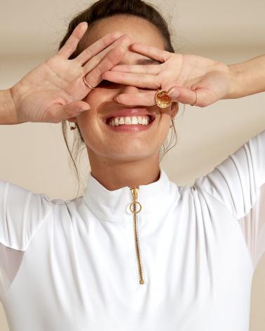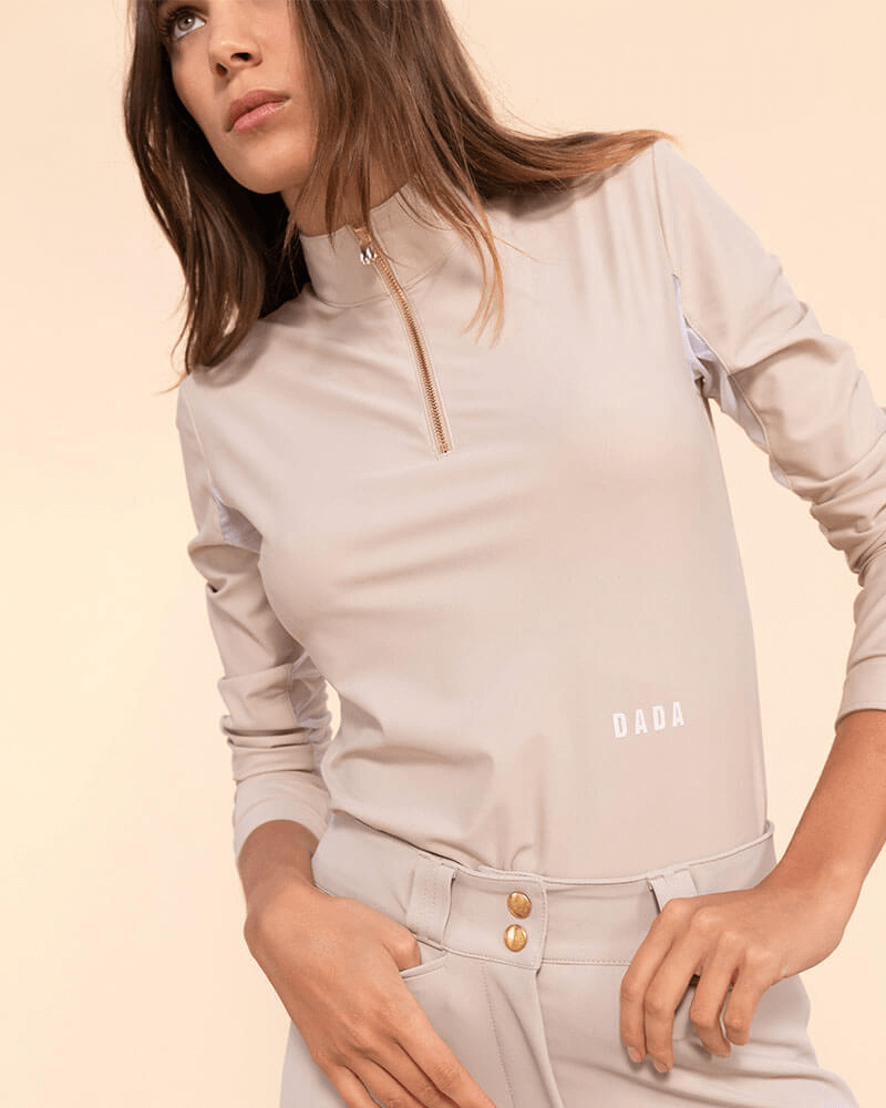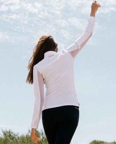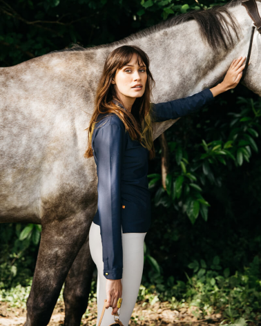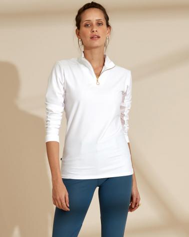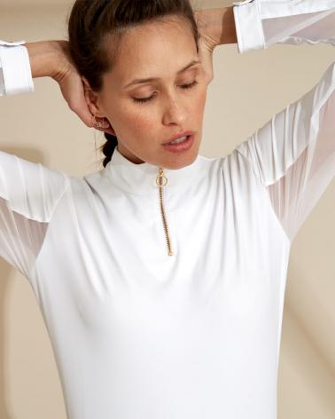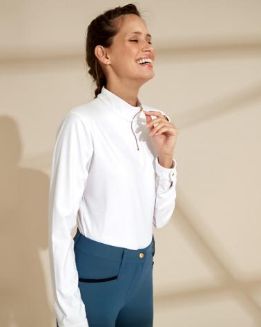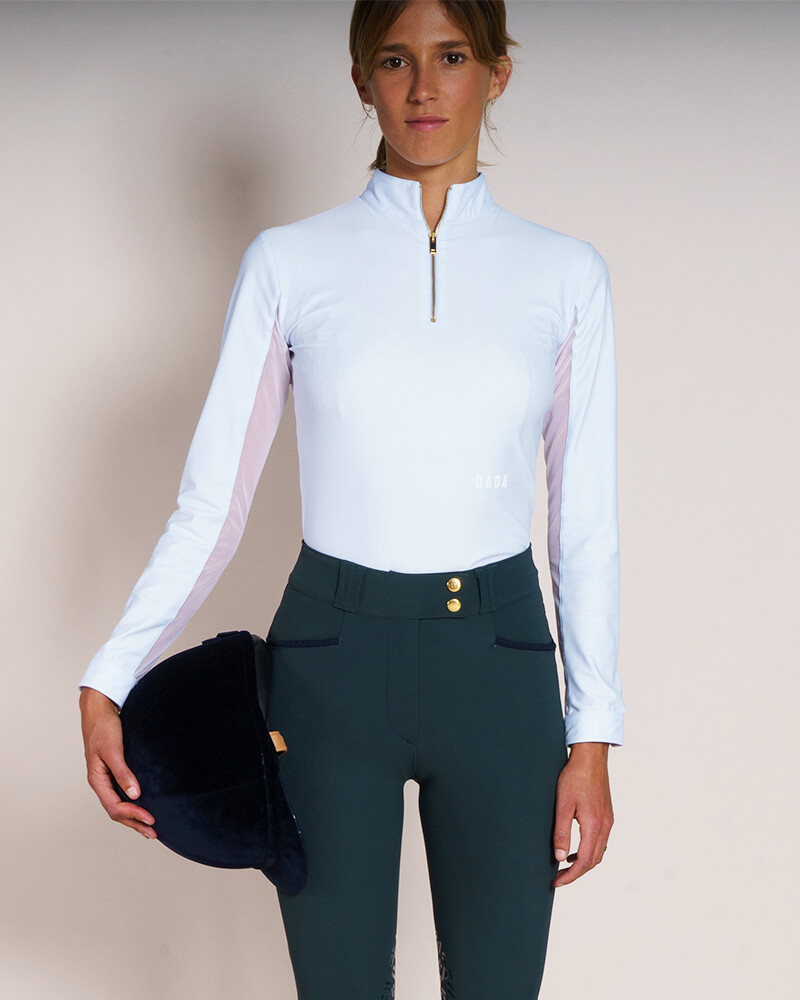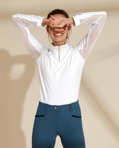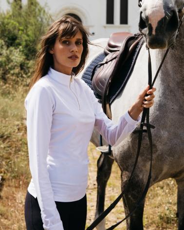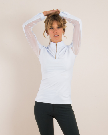 This equestrian polo shirt is perfect for training and showing (in white or sky blue version), it is discreetly ventilated thanks to its mesh under the arms.