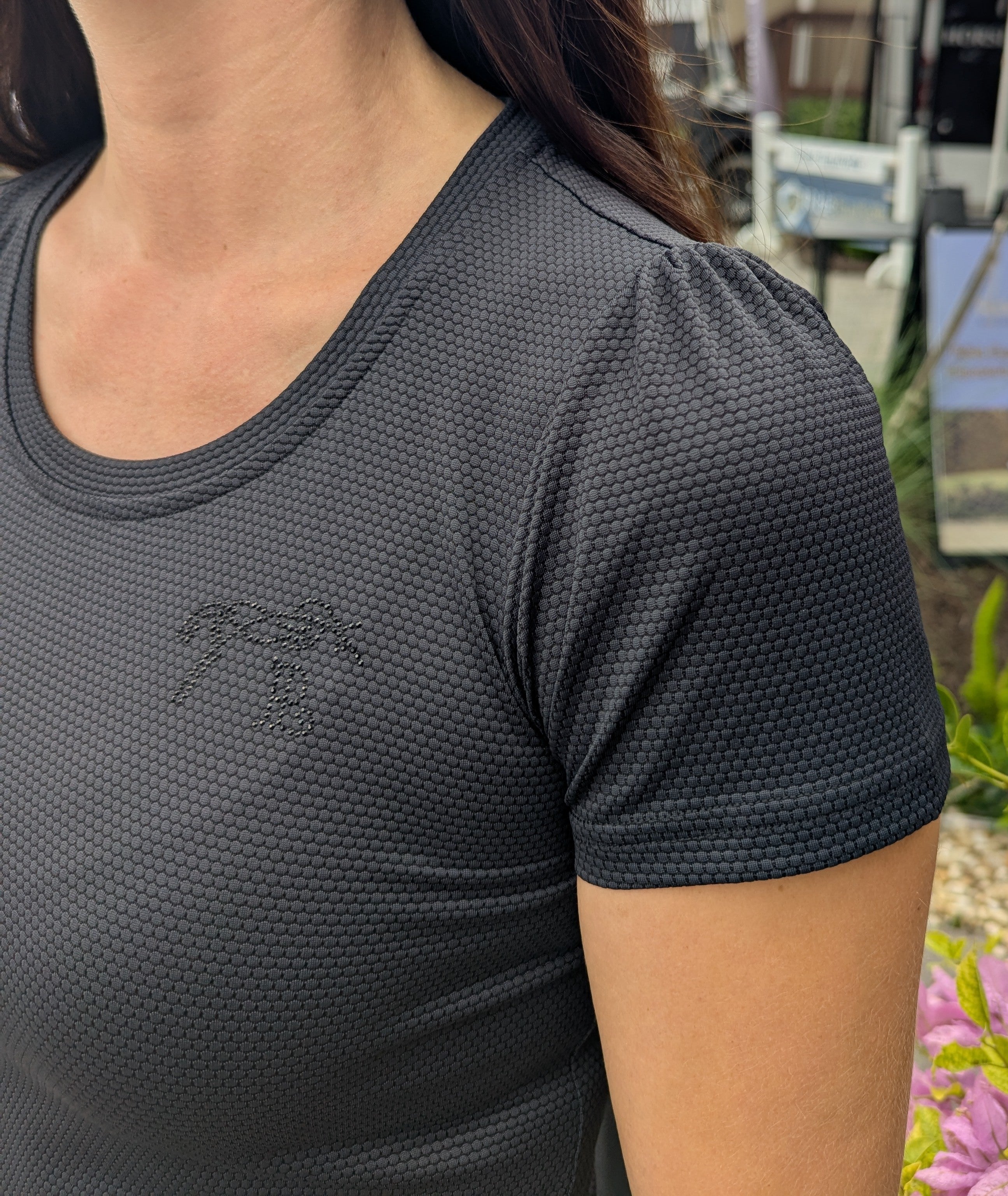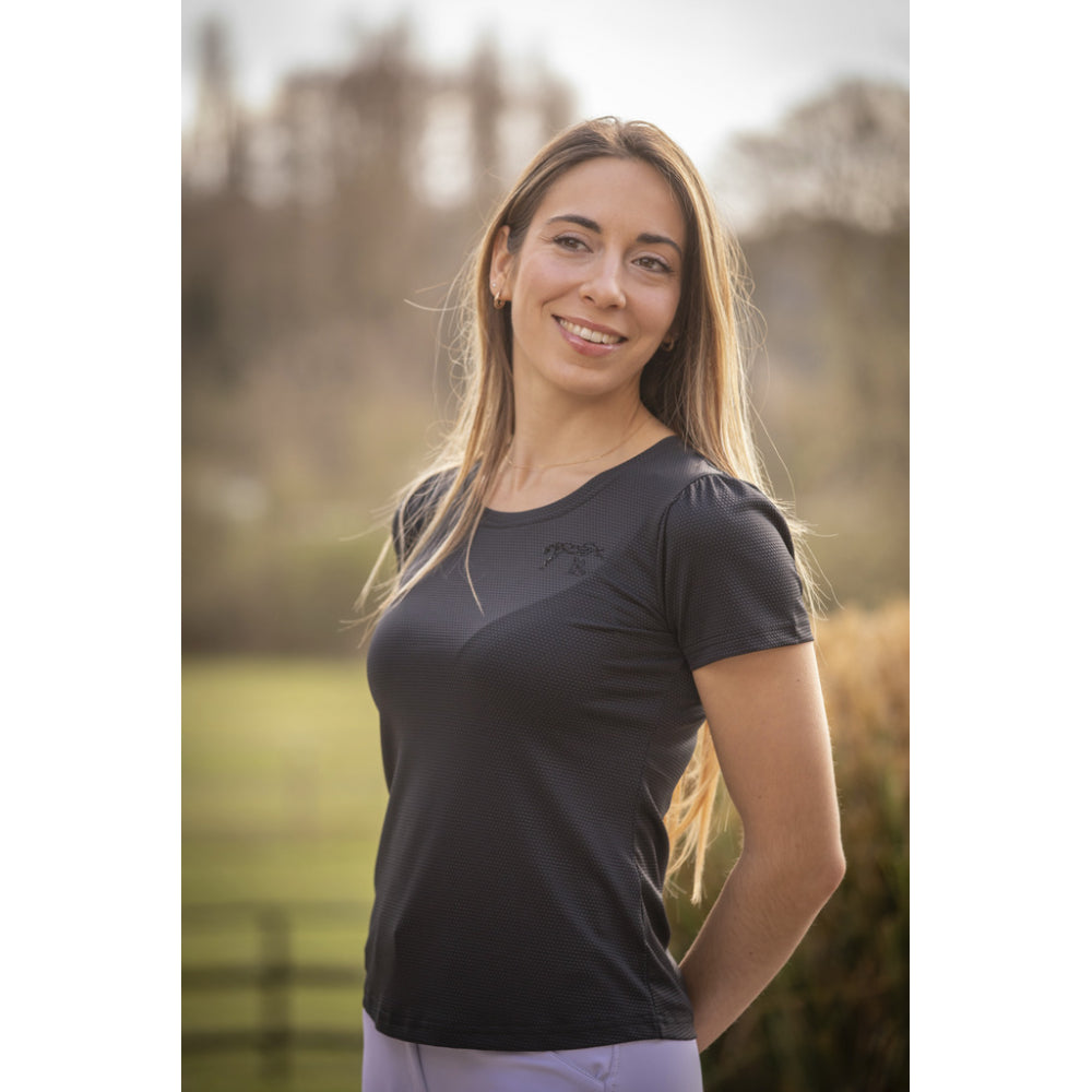 The Techty Honey t-shirt is crafted from a breathable, micro-perforated technical fabric. Ultra-light and subtly textured, it’s both original and understated, specifically designed for equestrian sports or other athletic activities. It features short sleeves with delicate gathers and a subtle rhinestone logo detail over the heart.