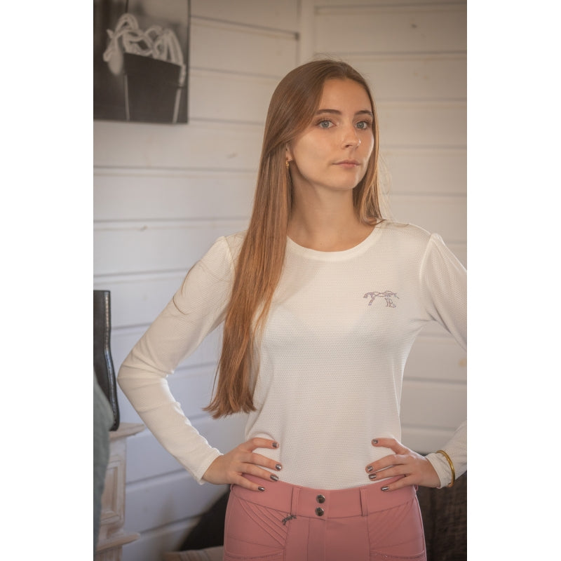 The Techty Honey t-shirt is crafted from a breathable, micro-perforated technical fabric. Ultra-light and subtly textured, it’s both original and understated, specifically designed for equestrian sports or other athletic activities. It features short sleeves with delicate gathers and a subtle rhinestone logo detail over the heart.